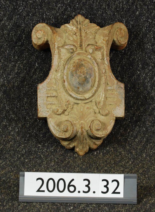 Hollow shield-shaped ornament with scrolled botanical motifs.Central egg-shaped motif.Reverse has eyelet for anchorage to masonry.Front has remnants of sand texturized paint.
