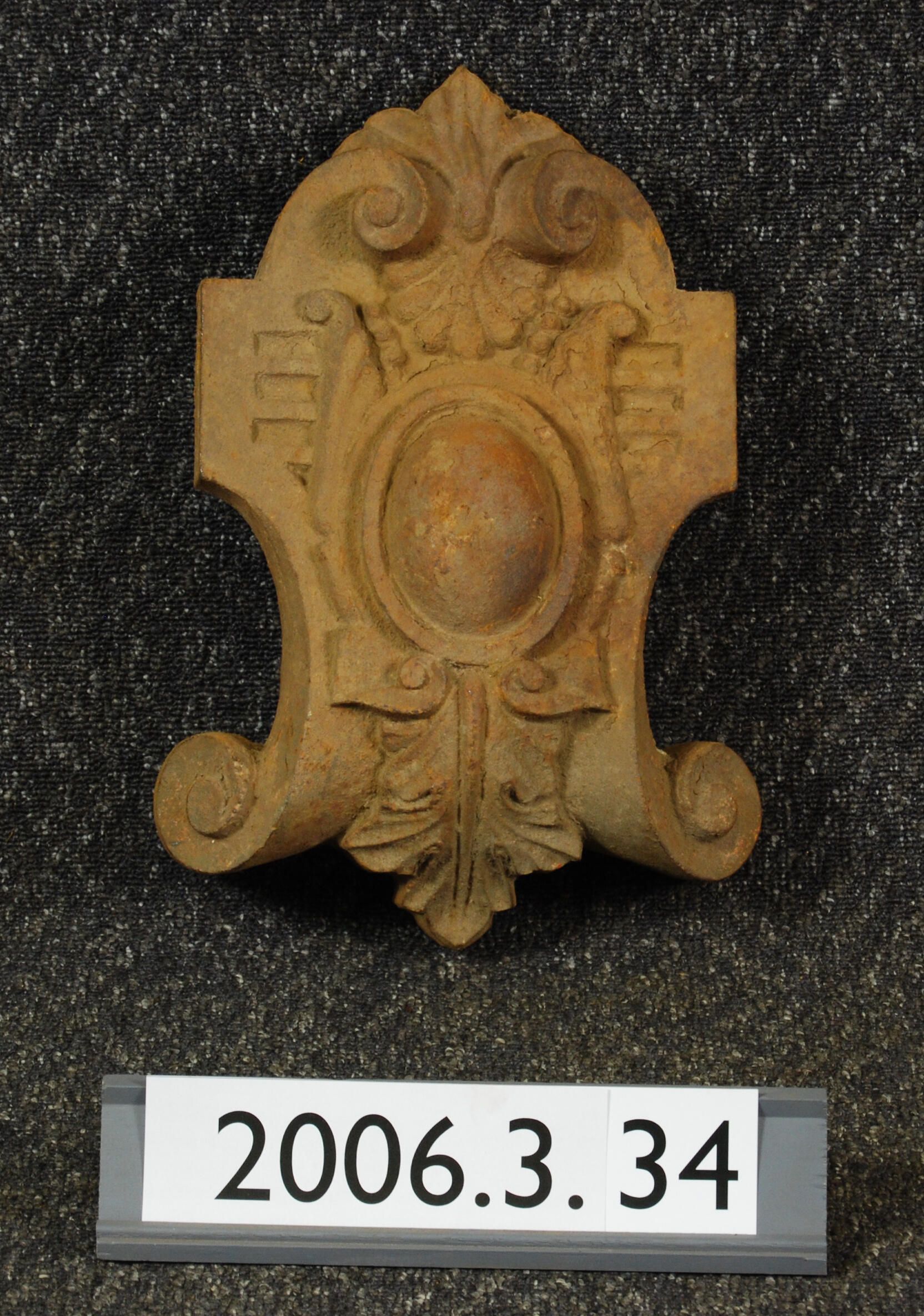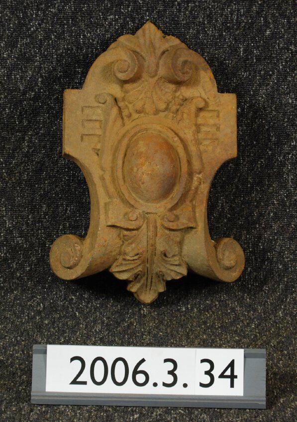 Hollow shield-shaped ornament with scrolled botanical motifs.Central egg-shaped motif.Reverse has eyelet for anchorage to masonry.Front has remnants of sand texturized paint.