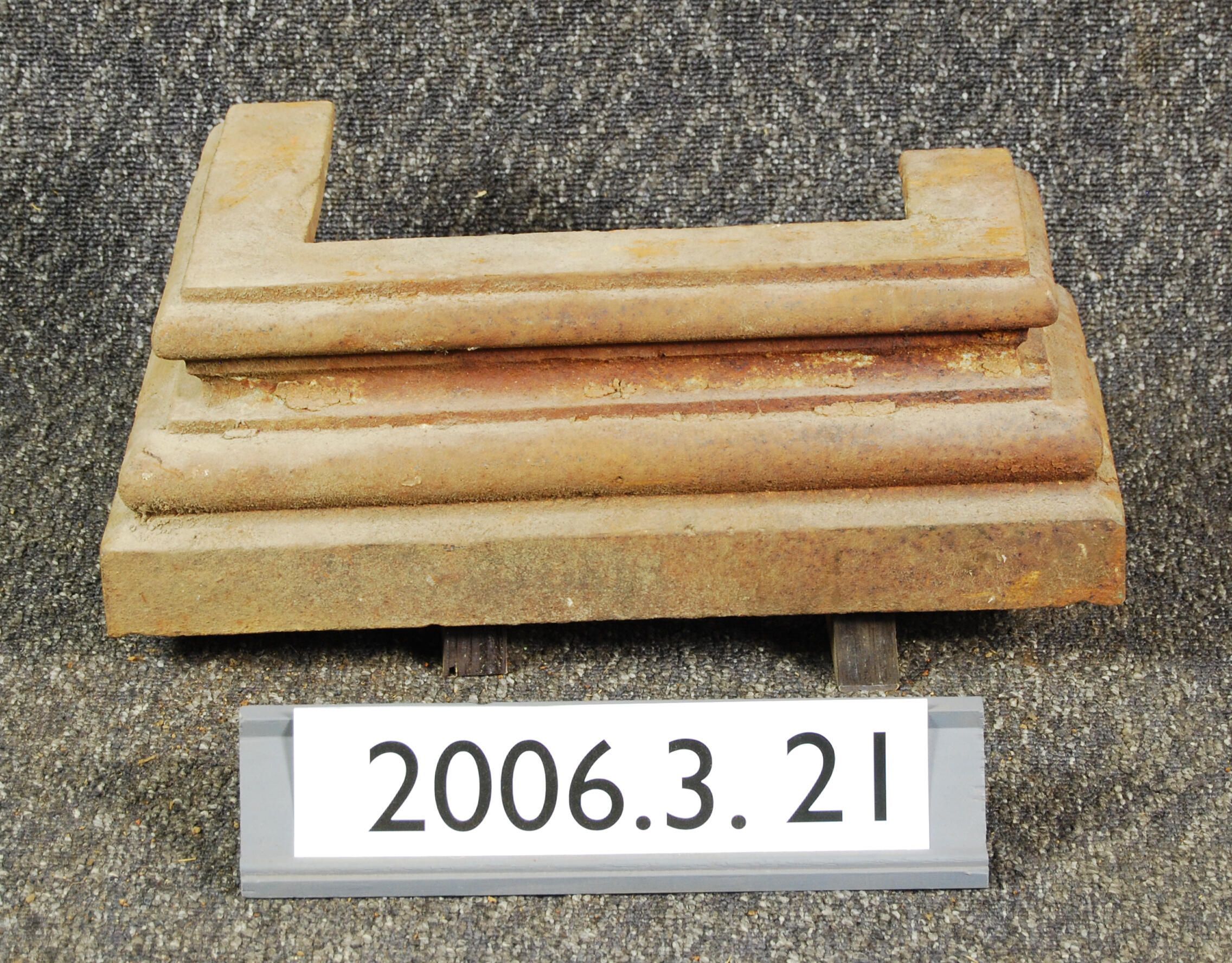 Cast iron ,(column?) base block from unidentified building.Compound molding profile,return on two sides,reverse has eyelet for anchorage to masonry.Front and sides have few remnants of sand texturized paint.