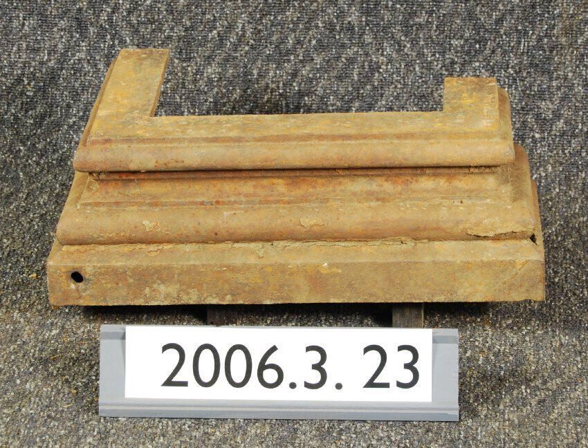 Cast iron ,(column?) base block from unidentified building.Compound molding profile,return on two sides,reverse has eyelet for anchorage to masonry.Front and sides have few remnants of sand texturized paint.