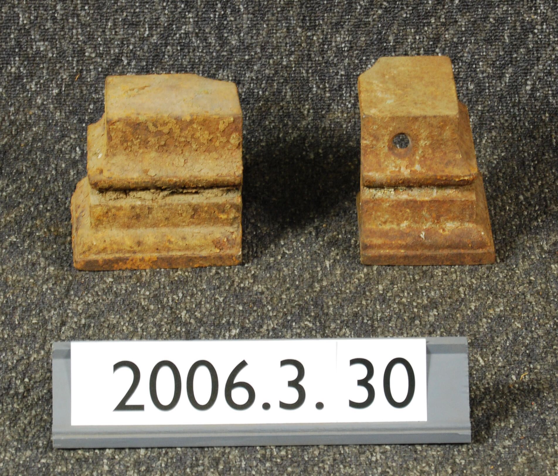 One lot of two,Cast iron, hollow quasi-rectangular (column?) base blocks from unidentified building.Compound molding profile,return on one side of each respective base block and countersunk hole at side of each base.Few remnants of paint.