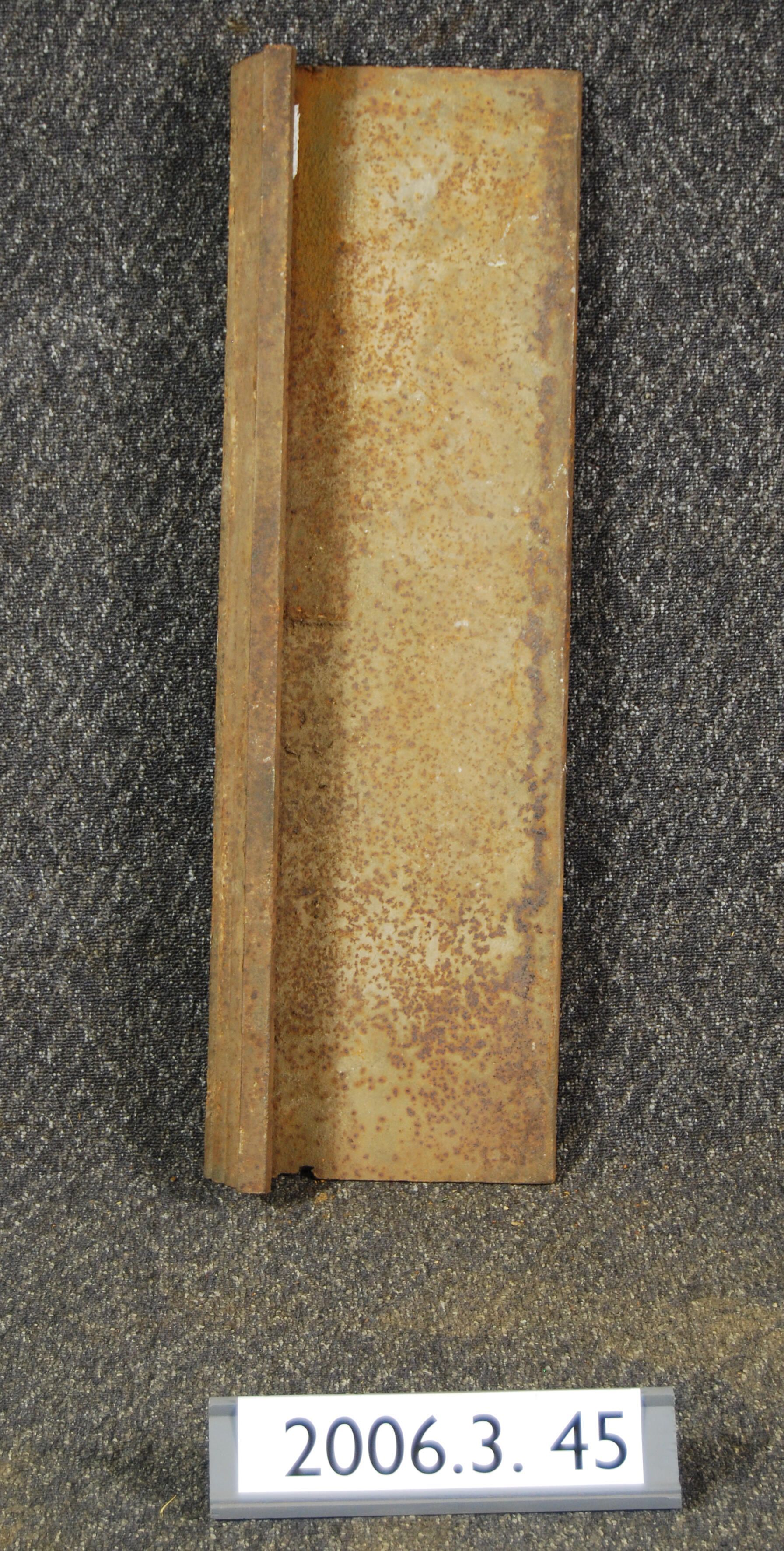 Cast iron plate. Probably from window sill of 1883 Smith and Watson Ironworks Building second or third floor.Rectangular,compound molding profile on front edge.Few remnants of paint.