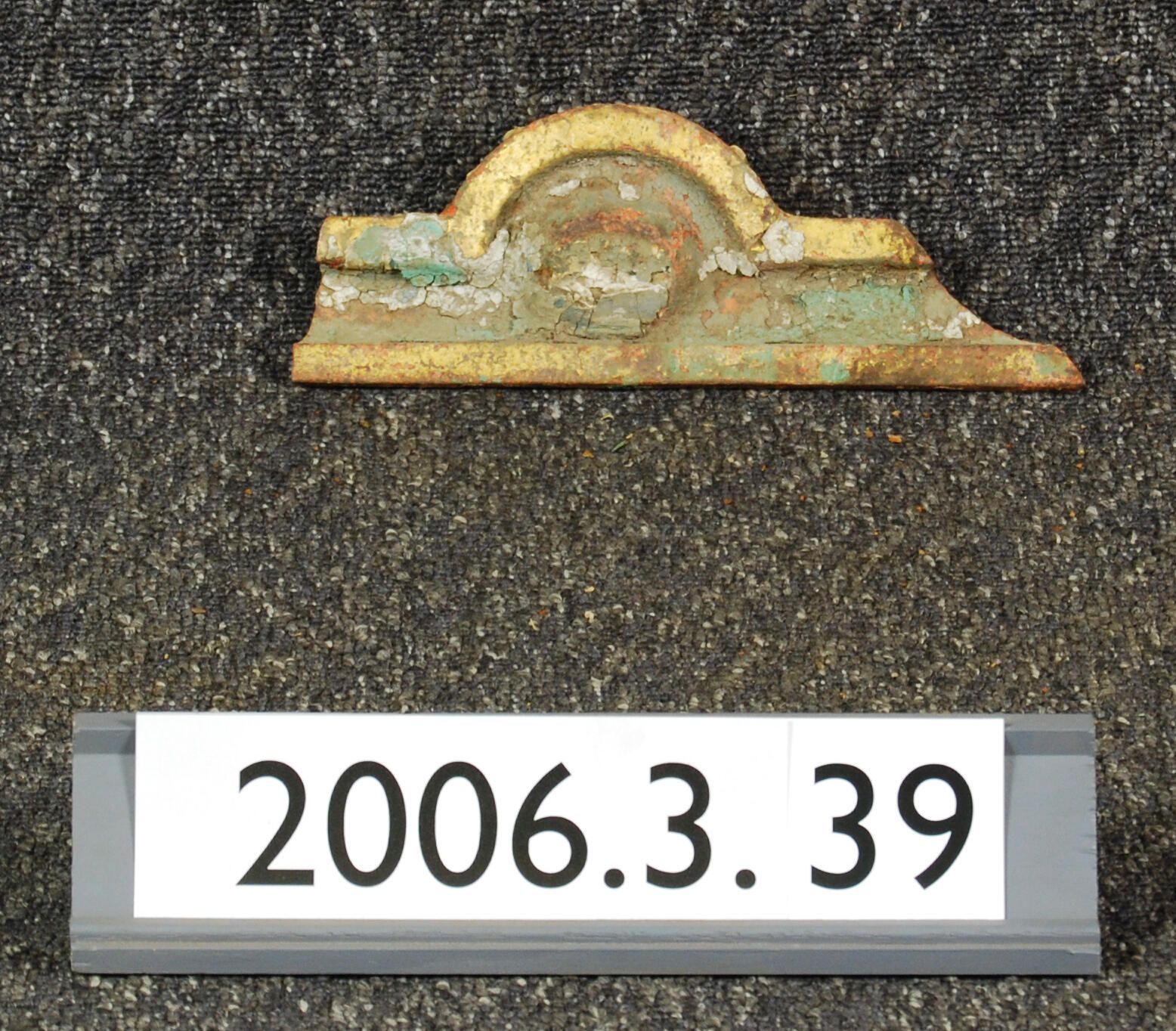 Cast iron ornament fragment from unidentified building,semi-circular drop and plain button,cove molding,truncated at both ends .Multiple layers of paint including original gold-colored paint (possibly gilded).
