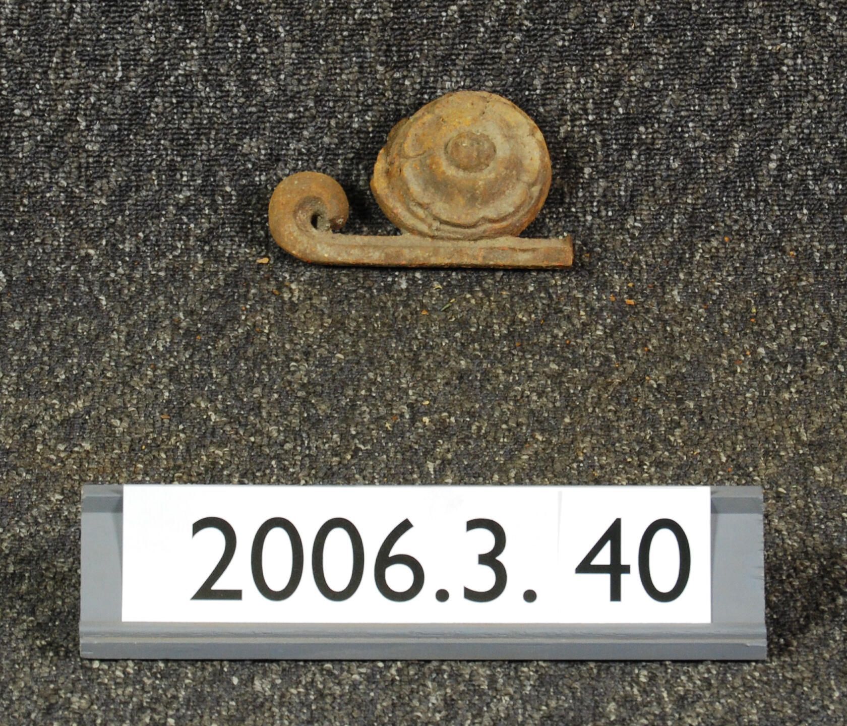 Cast iron ornament fragment from unidentified building,rosette and scroll motif.One end is truncated .Few remnants of paint.