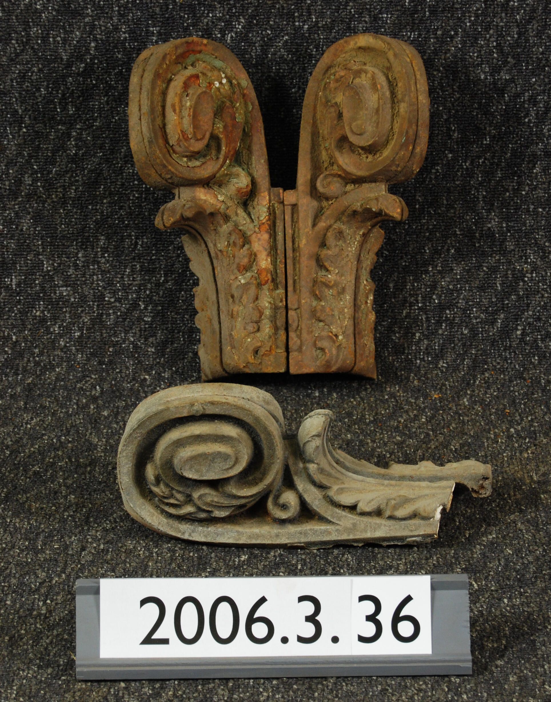 Cast iron set of three volute ornaments,from unidentified building.Scroll/botanical motifs, each volute is composed of two-piece hollow castings riveted together.Reverse is contoured to fit cylindrical column.One volute has galvanized surface and is truncated.All volute ornaments have remnants of paint.