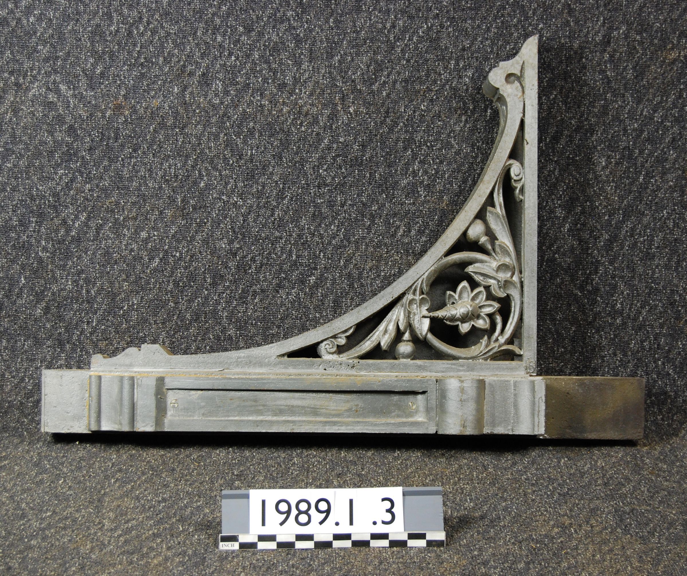 Cast iron bracket from 1881 Ladd Block, composed of three separate castings bolted/riveted together.Bracket is hollow,one side has open filligree botanical motif ornamentation. One side of bracket has smaller console casting with scroll ornament.Has 'U"-shaped channel mounted on back.Bracket has been refinished and painted grey/aluminum colored.