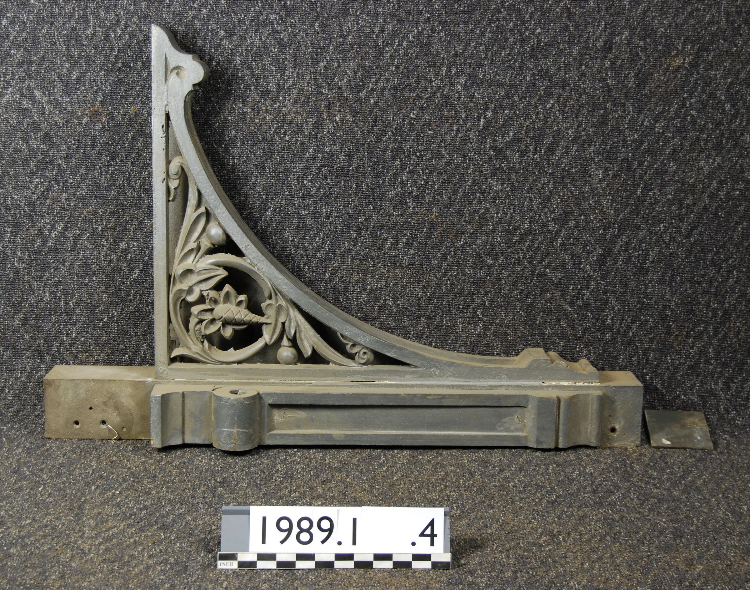 Cast iron bracket from 1881 Ladd Block, composed of three separate castings bolted/riveted together.Bracket is hollow,one side has open filligree botanical motif ornamentation. One side of bracket has smaller console casting with scroll ornament.Has 'U"-shaped channel mounted on back.Bracket has been refinished and painted grey/aluminum colored.
