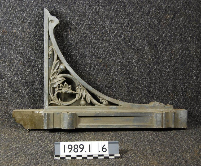 Cast iron bracket from 1881 Ladd Block, composed of three separate castings bolted/riveted together.Bracket is hollow,one side has open filligree botanical motif ornamentation. One side of bracket has smaller console casting with scroll ornament.Has 'U"-shaped channel mounted on back.Bracket has been refinished and painted grey/aluminum colored.