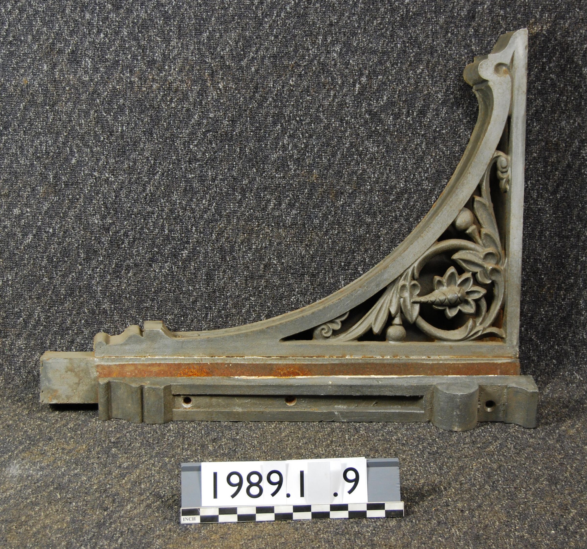 Cast iron reproduction bracket , composed of two separate castings bolted together.Bracket is hollow,one side has open filligree botanical motif ornamentation. One side of bracket has smaller console casting with scroll ornament.Has angle iron mounted on back.Bracket painted grey/aluminum colored.