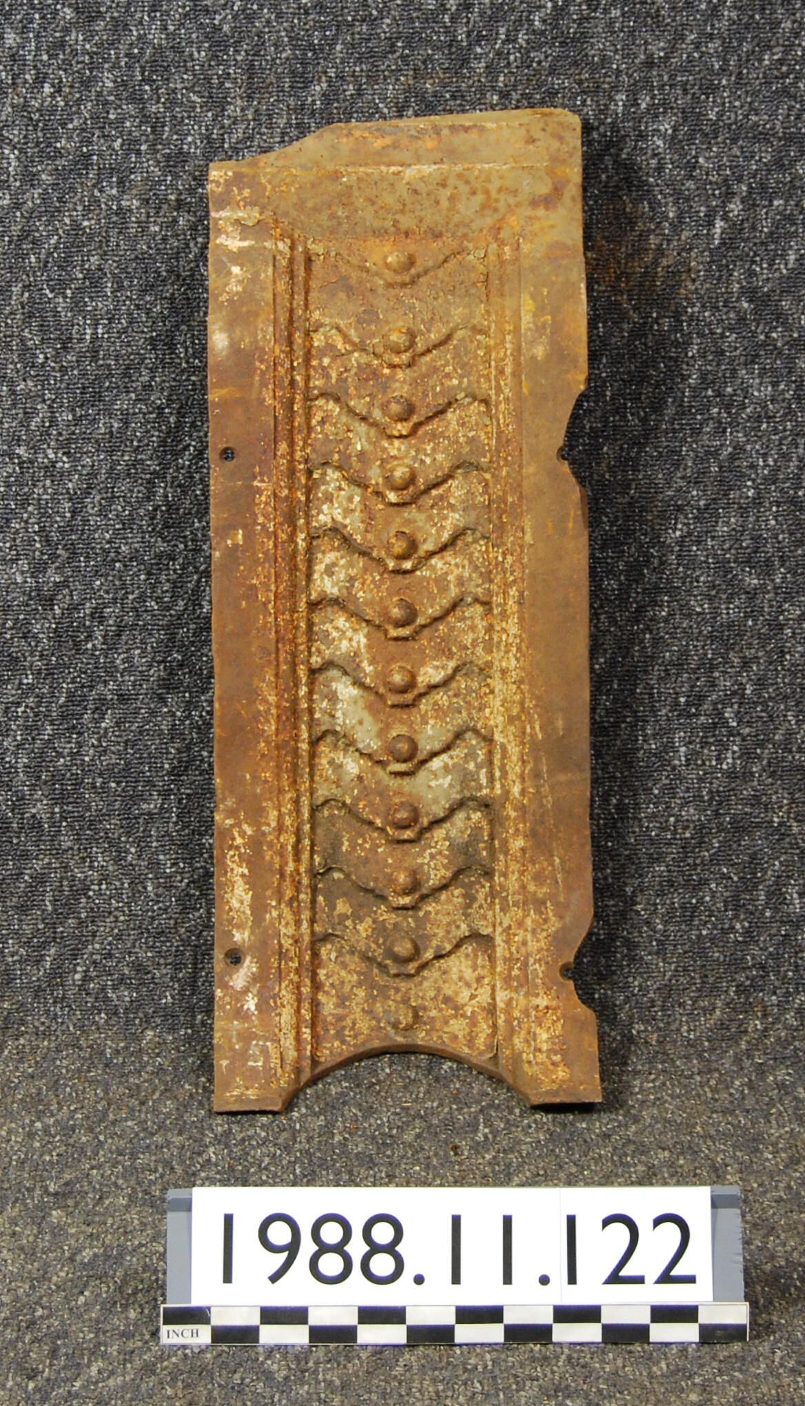 Cast iron curved plate from side of spandrel assembly.Has scaled ornamentation,upper end is truncated,pieces missing at edge.
