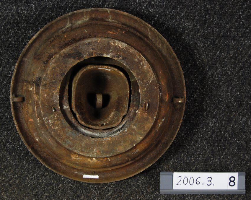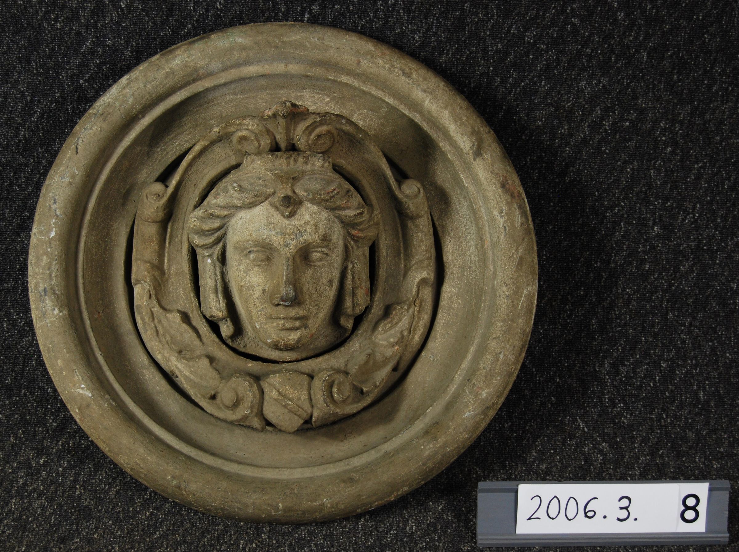 Cast iron medallion ornament possibly from 1875 Dekum and Reed block.Circular frame with inset ovoid botanical motif frame.Central classical revival female figurehead.medallion is composed of three separate castings.Has original painted surface.
