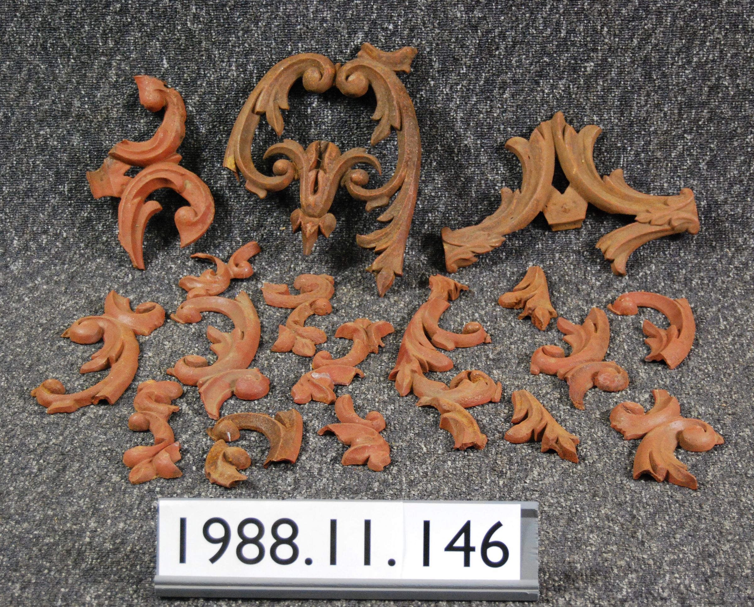 Cast iron,one lot of twenty ornament fragments from unidentified building,filligree botanical motif,originally from at least three separate castings,some fragments match,all of same design pattern.Ninteen fragments re-painted with red primer.One fragment rusty.