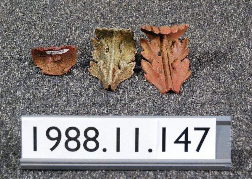 Cast iron,one lot of three ornament fragments from unidentified building(s),acanthus leaf motif ,probably from capital(s). One ornament has original paint,two have been repainted with red primer,one is short fragment.