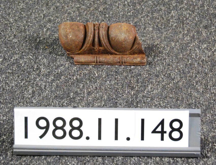 Cast iron, ornament fragment from unidentified building,egg and dart motif and lozenge and reel motif ,truncated at both ends. repainted with red primer,