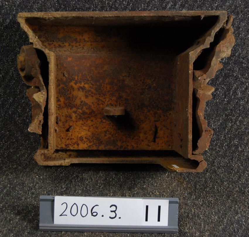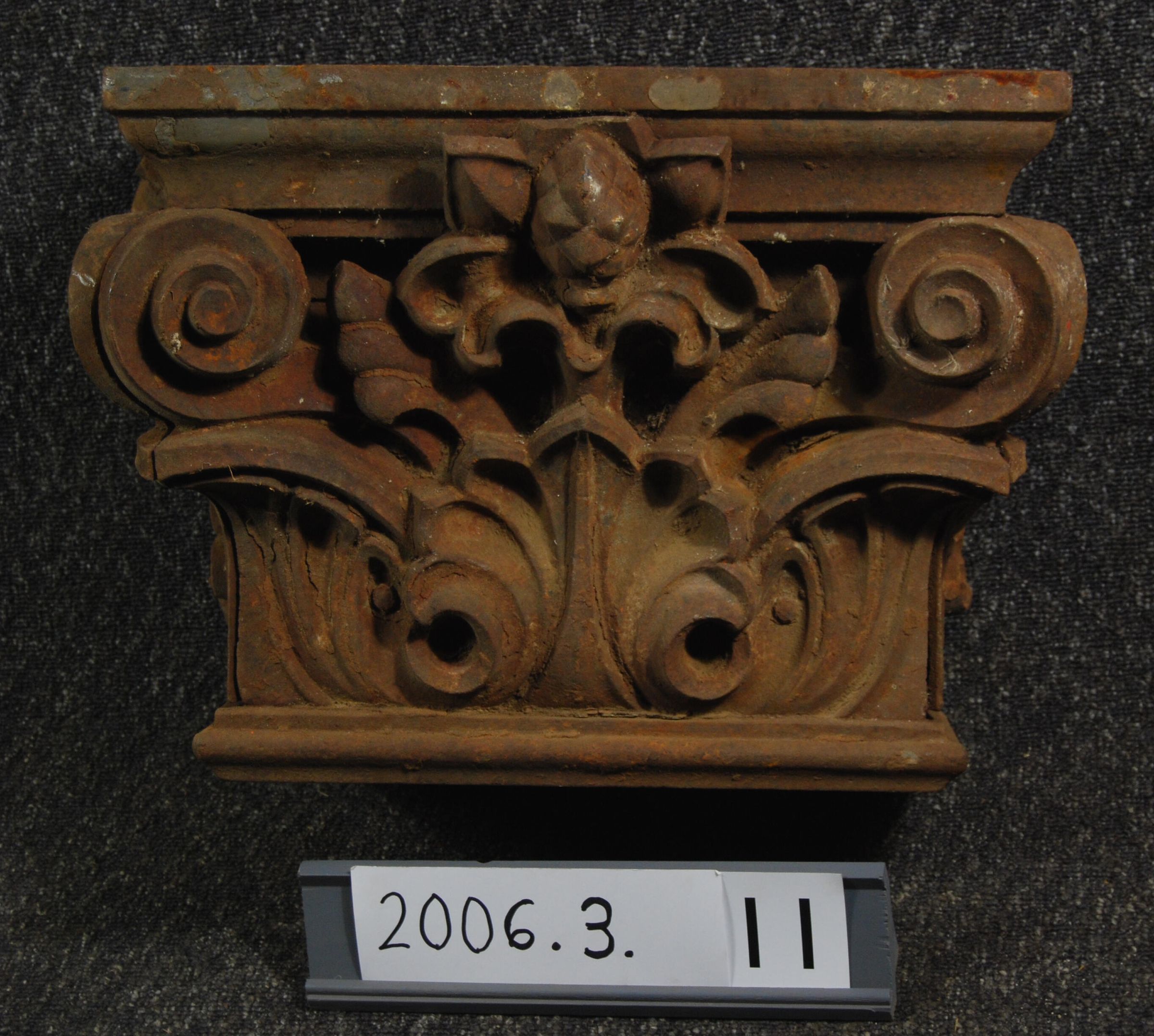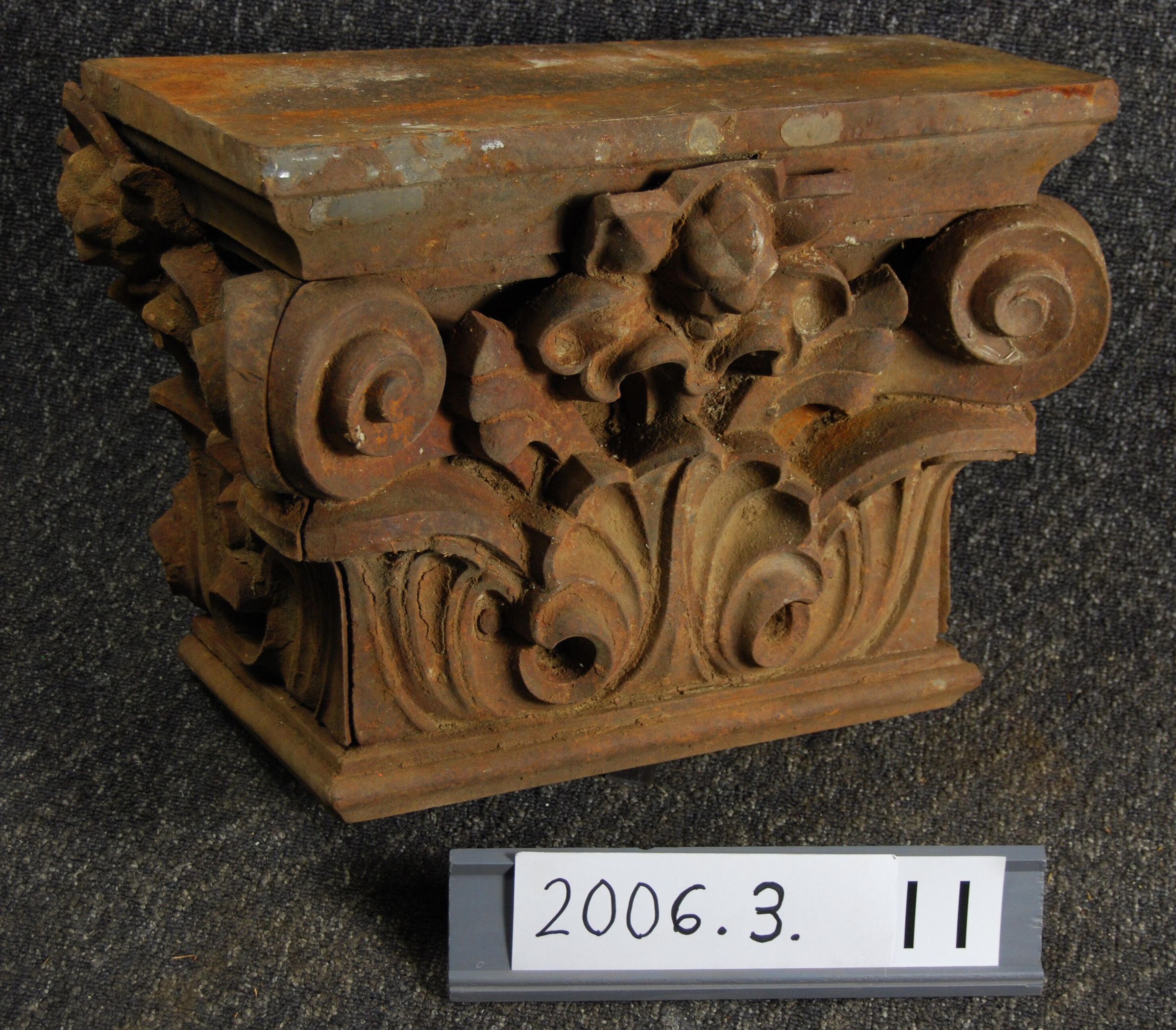 Hollow block with compound molding at top and bottom edges,return at sides,applied acanthus and volute ornaments on front and two sides,trimmed down on each respective side..Reverse has eyelet for anchorage to masonry.Front and sides have few remnants of paint.