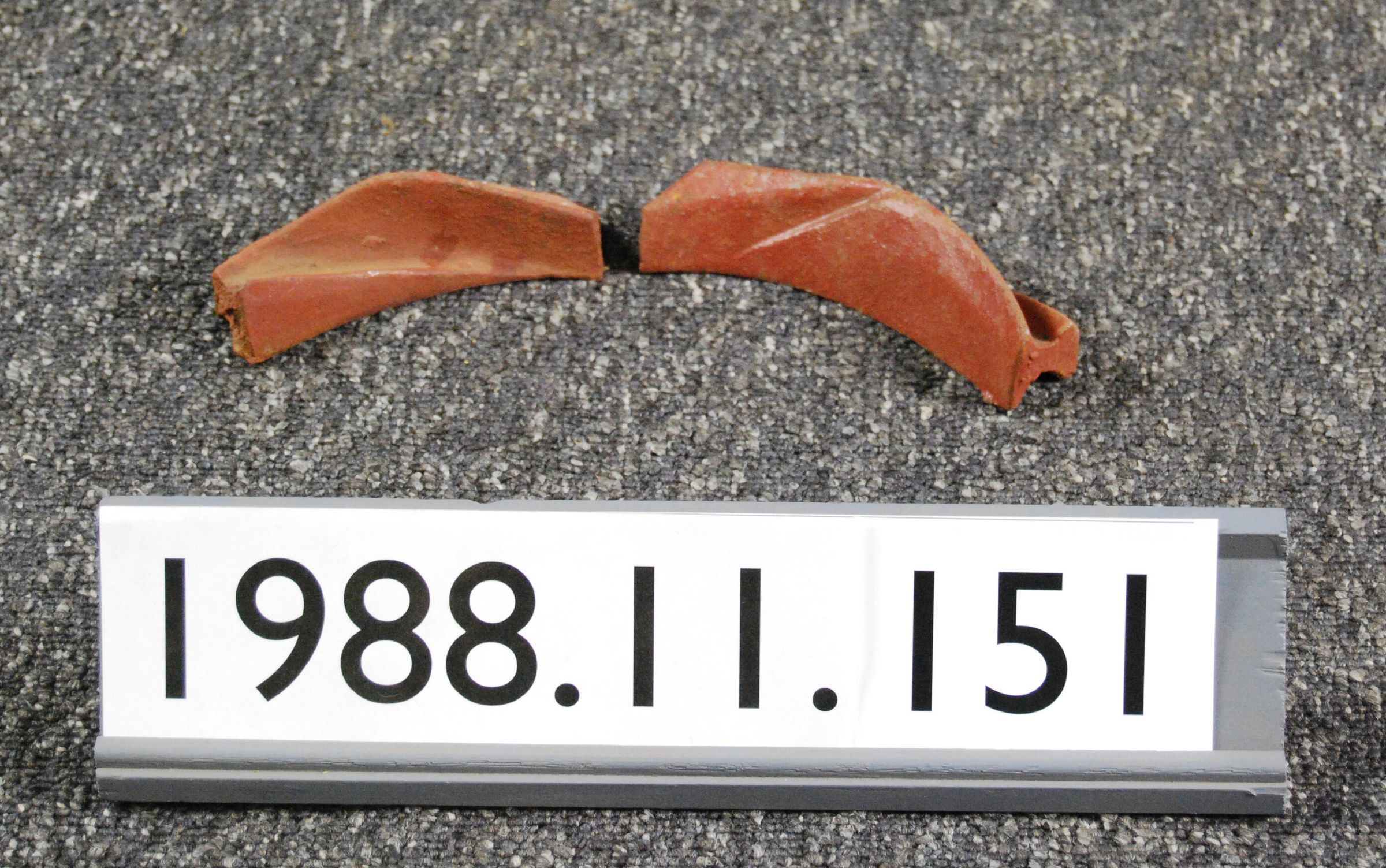 Cast iron,one lot of two ornament fragments from unidentified building,ribbon/swag motif ,both truncated at ends,re-painted with red primer.