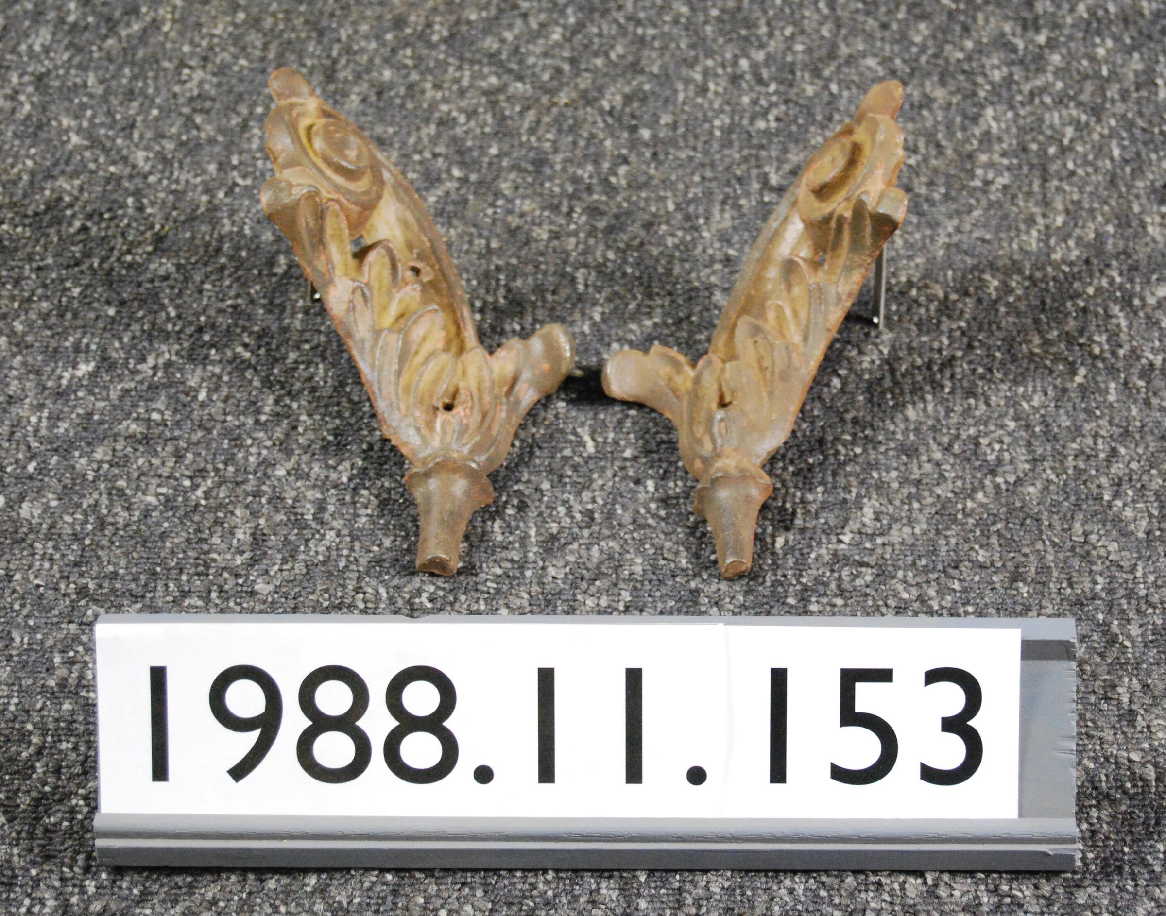 Cast iron,one lot of two ornaments from unidentified building,each with botanical motif volutes,acanthus leaf and stem,probably from capital assembly.Few remnants of paint.