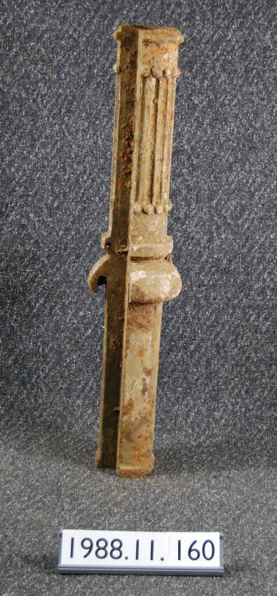 Cast iron column from unidentified origin (or fence post?),hollow,semi-cylindrical,lower end designed to mount below grade,upper portion has flange and is ringed,sides are fluted,has series of beaded ornaments.Has remnants of paint.