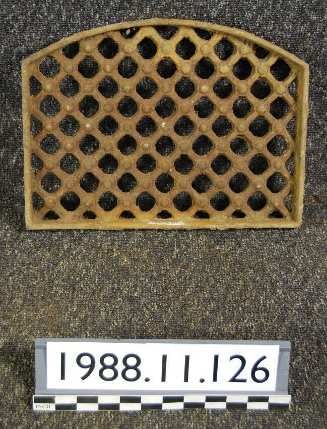 Cast iron grille, frame with arched top,straight sides,open diamond-shaped lattice with button ornaments on front. Remnants of paint on front. Probably basement ventilator grille.