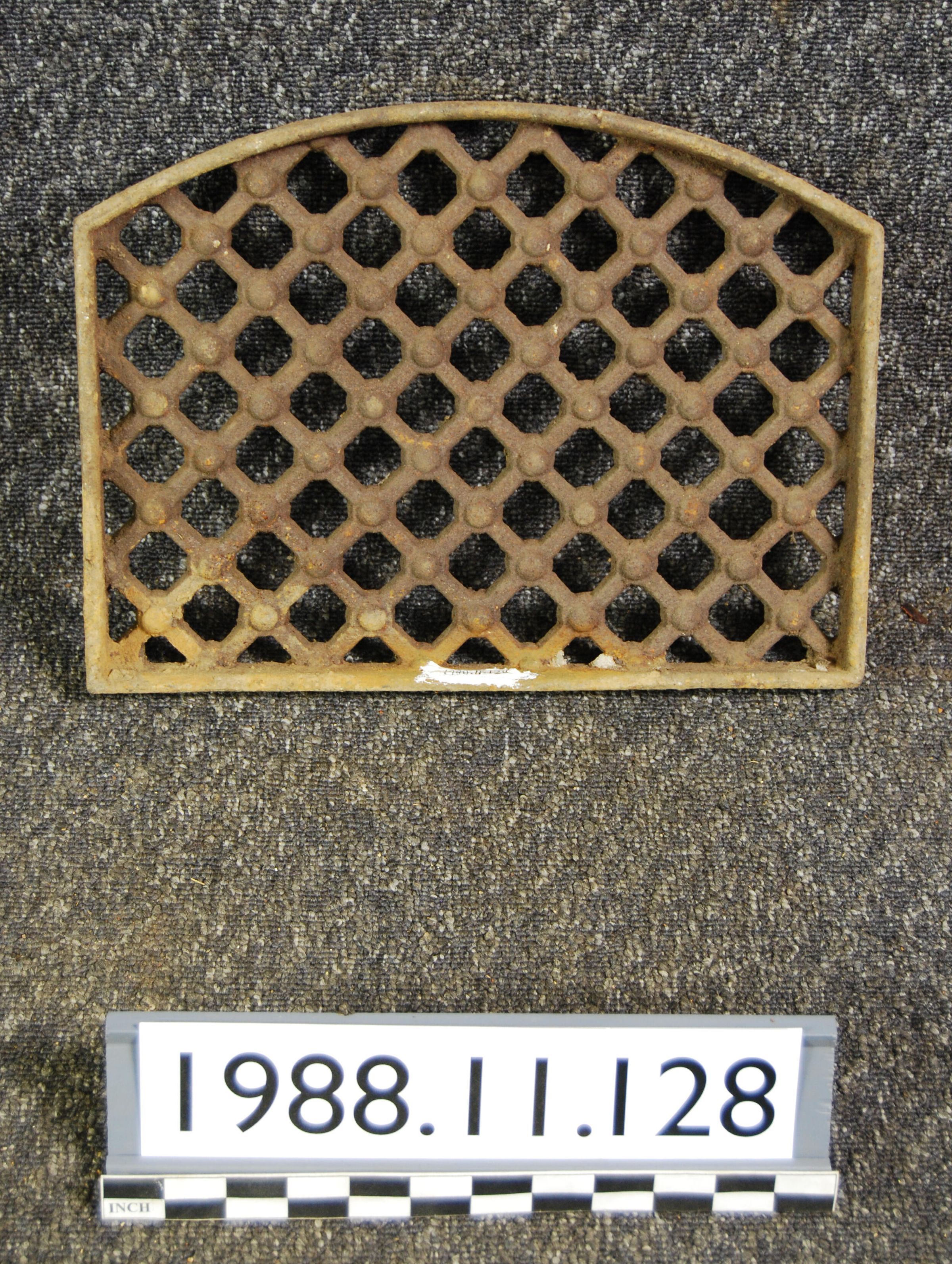 Cast iron grille, frame with arched top,straight sides,open diamond-shaped lattice with button ornaments on front. Remnants of paint on front. Probably basement ventilator grille.