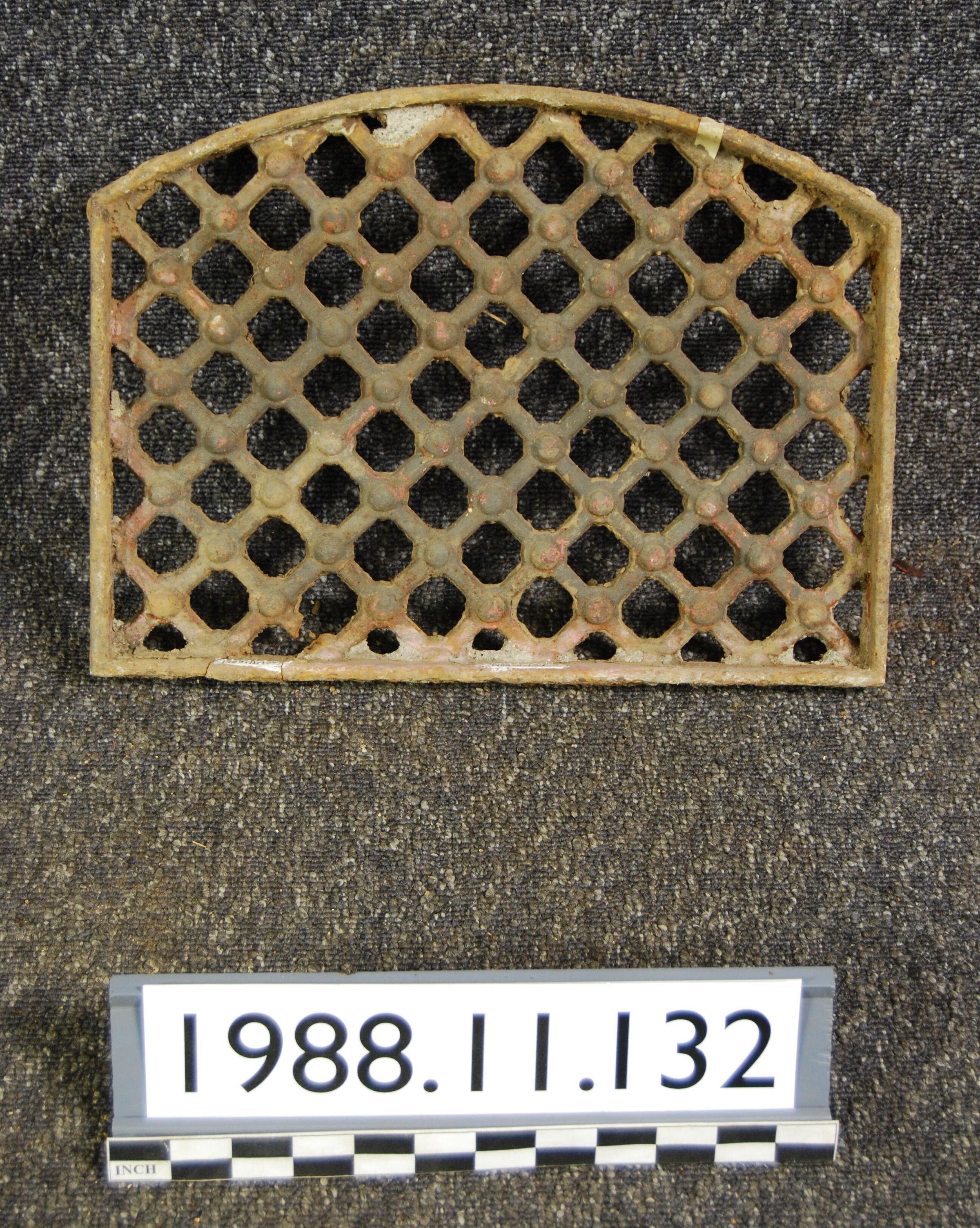 Cast iron grille, frame with arched top,straight sides,open diamond-shaped lattice with button ornaments on front. Remnants of paint on front. Probably basement ventilator grille.