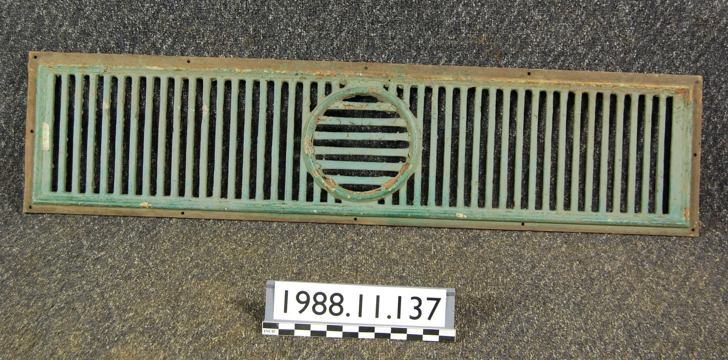 Cast iron grille, rectangular frame , circular center piece with horizontal grlle infill, remainder of frame filled with vertical grille.Painted green on front. Probably ventilator grille.