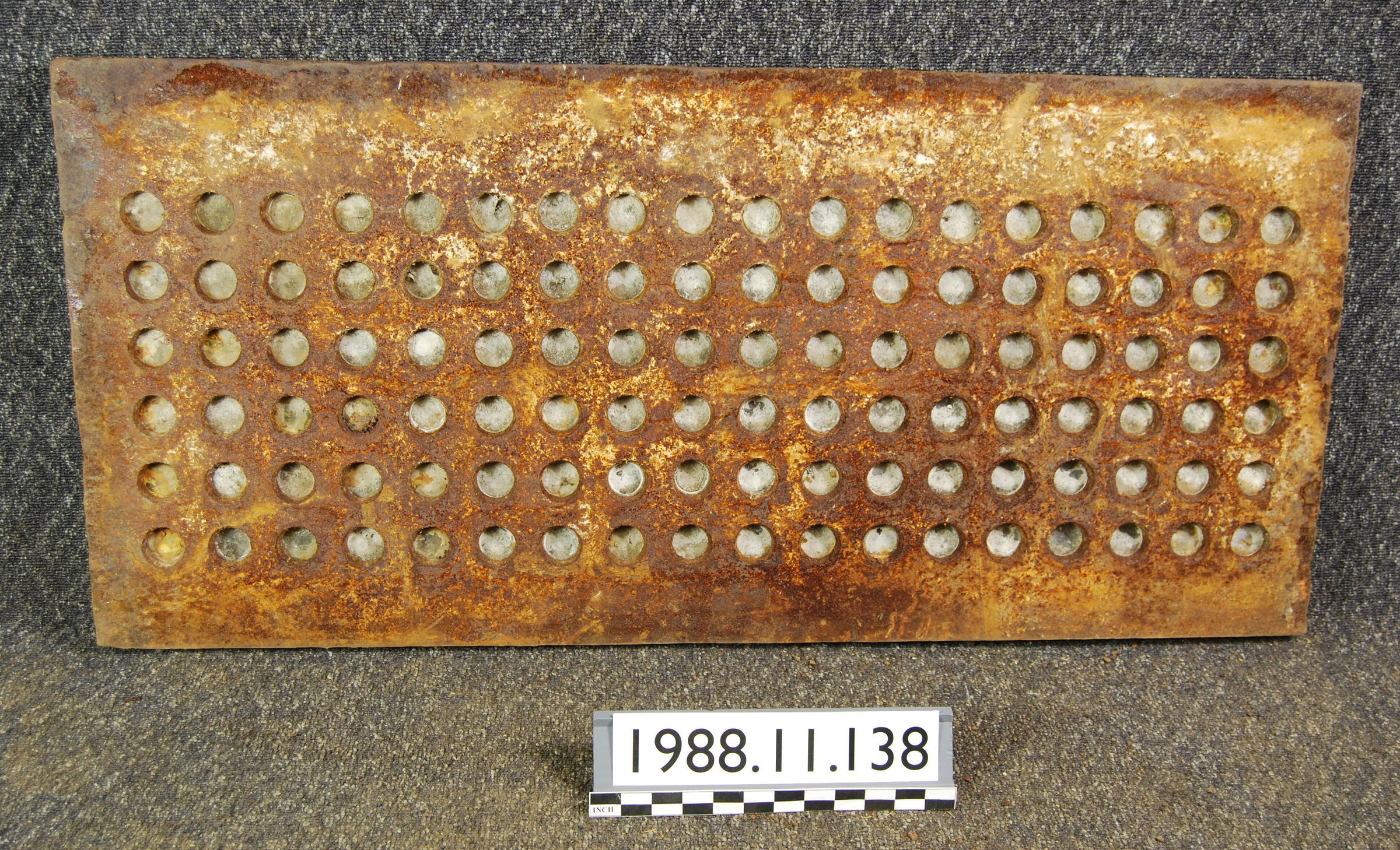 Cast iron vault light, rectangular plate withe series of equi-distant holes fitted with cylindrical glass plugs, (to emit natural sunlight). Flange on one edge.