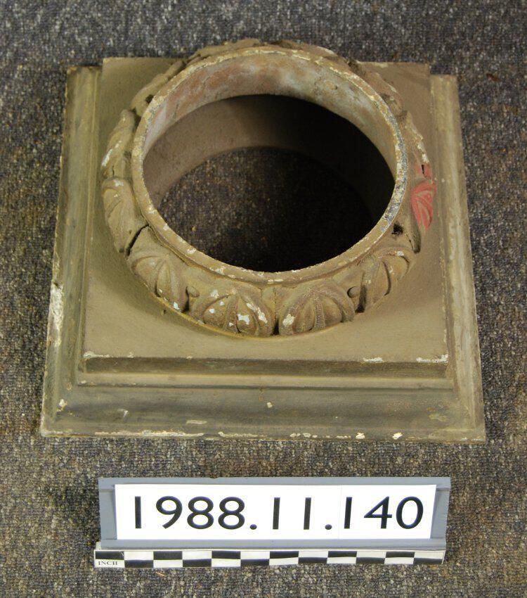 Cast iron capital, square top,edges have compound molding profile. Lower portion (bell) of capital is round and is decorated with applied zinc egg and dart variation motif ornament. Interior of capital is hollow and has cylindrical opening to fit 9.25" diameter round column. One of a pair