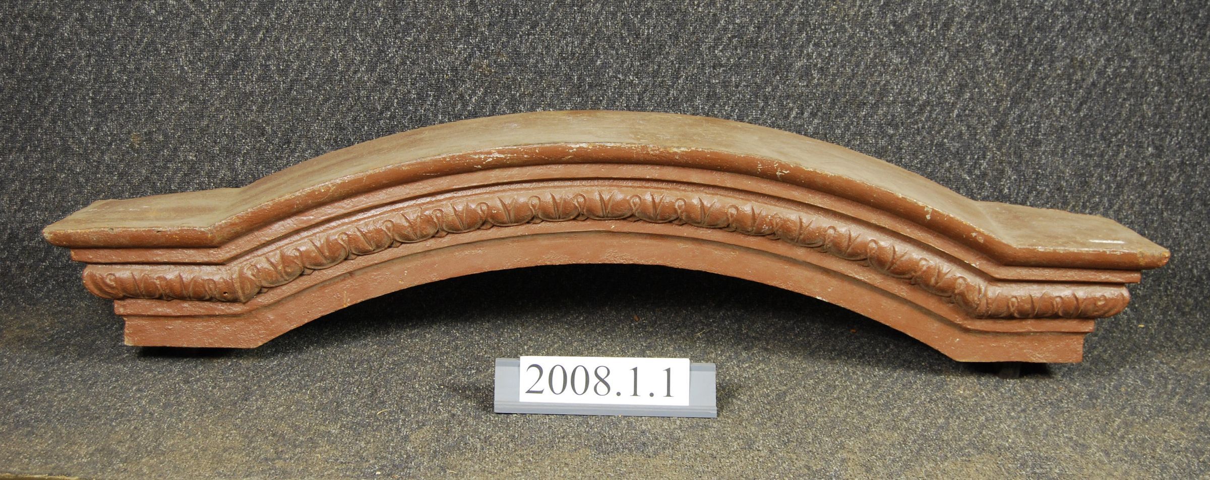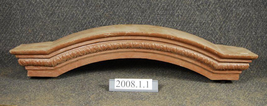 Cast iron lintel Originally installed on Wasserman / Weil Building(s) front facade, second floor above window brackets. Arched central body flanked on each side with flat top. Compound molded front with lamb's tongue motif. Hollow back with two vertical anchor rods. Painted with multiple layers of paint.