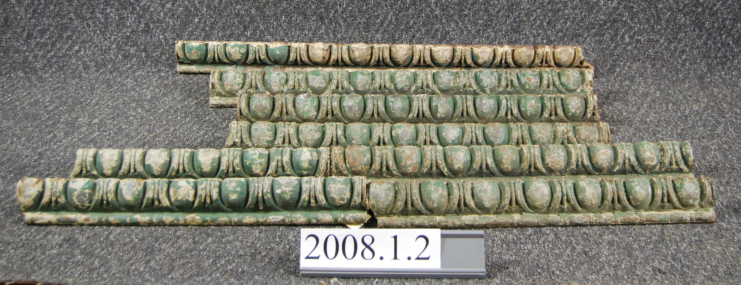 Cast iron, one lot of eight molding segments with egg and dart motif Painted with multiple layers of paint, lastly green.Each segment has eyelet on back for mounting. One segment is 35.5";two @ 32.75"; one @26.75"; one @26.50"; one@21.25".