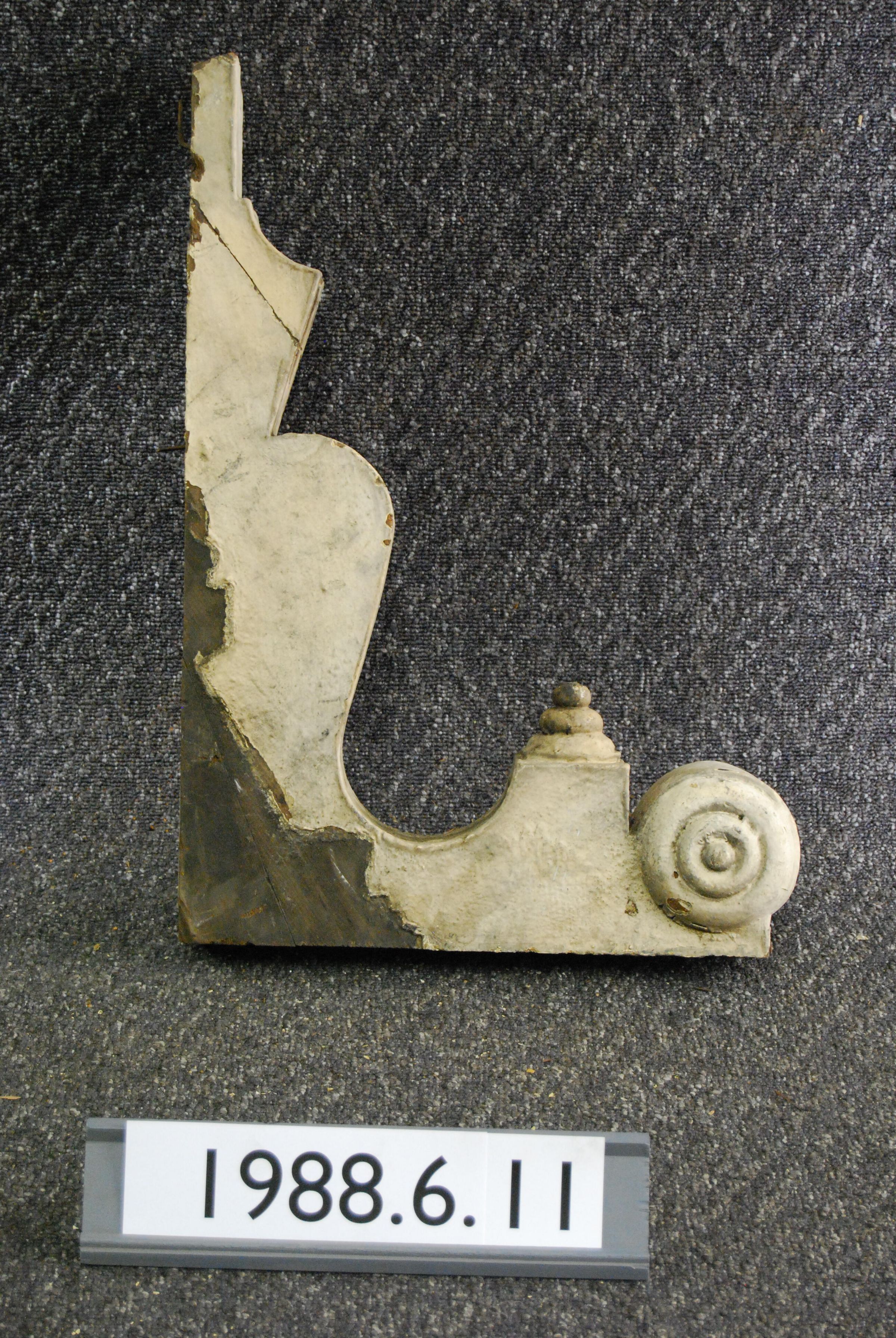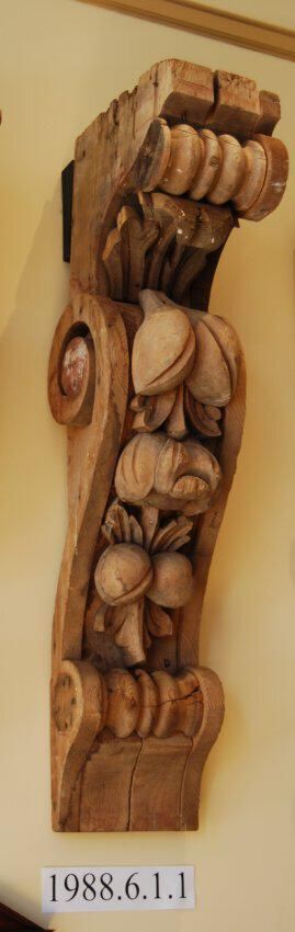 Wood (Cedar) cornice bracket. Originally from 1868 Ladd and Tilton Bank. Scrolled sides. All six bullseye ornaments are missing. Upper left cheek missing. Front has carved botanical / fruit motif. Has turned reel ornaments - one at top and one at lower end. Composed of multiple parts fastened with square nails. Stripped of paint.