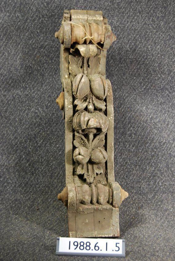 Wood (Cedar) cornice bracket. Originally from 1868 Ladd and Tilton Bank. Scrolled sides with bullseye ornaments (three ornaments replaced). Front has carved botanical / fruit motif. Has upper and lower turned reel (upper reel replaced) composed of multiple parts fastened with square nails.Has some replacement parts. Intact original paint layers.