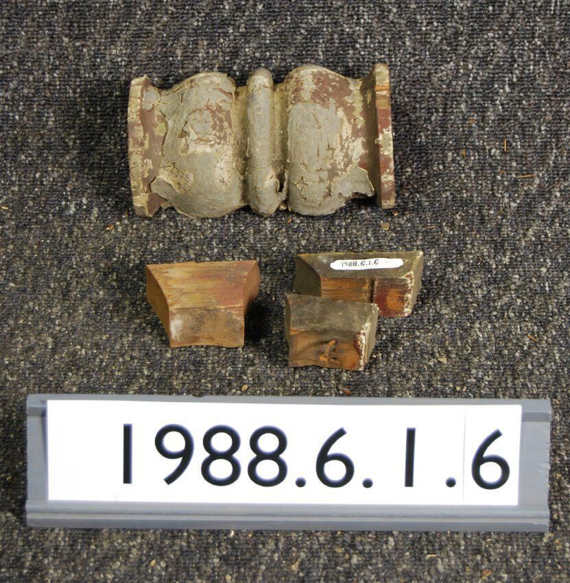 Wood (Cedar) cornice bracket parts originally from 1868 Ladd and Tilton Bank. Includes lower reel ornament with original paint. Three small fragments from side cheeks.