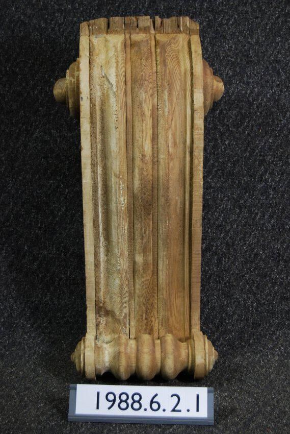 Wood (Cedar) bracket. Scrolled sides with two bullseye ornaments each respective side. Vertically reeded front. Lower portion has turned reel ornament. Composed of multiple laminated parts fastened together with square nails. Stripped of paint. (Possible entrance bracket?)