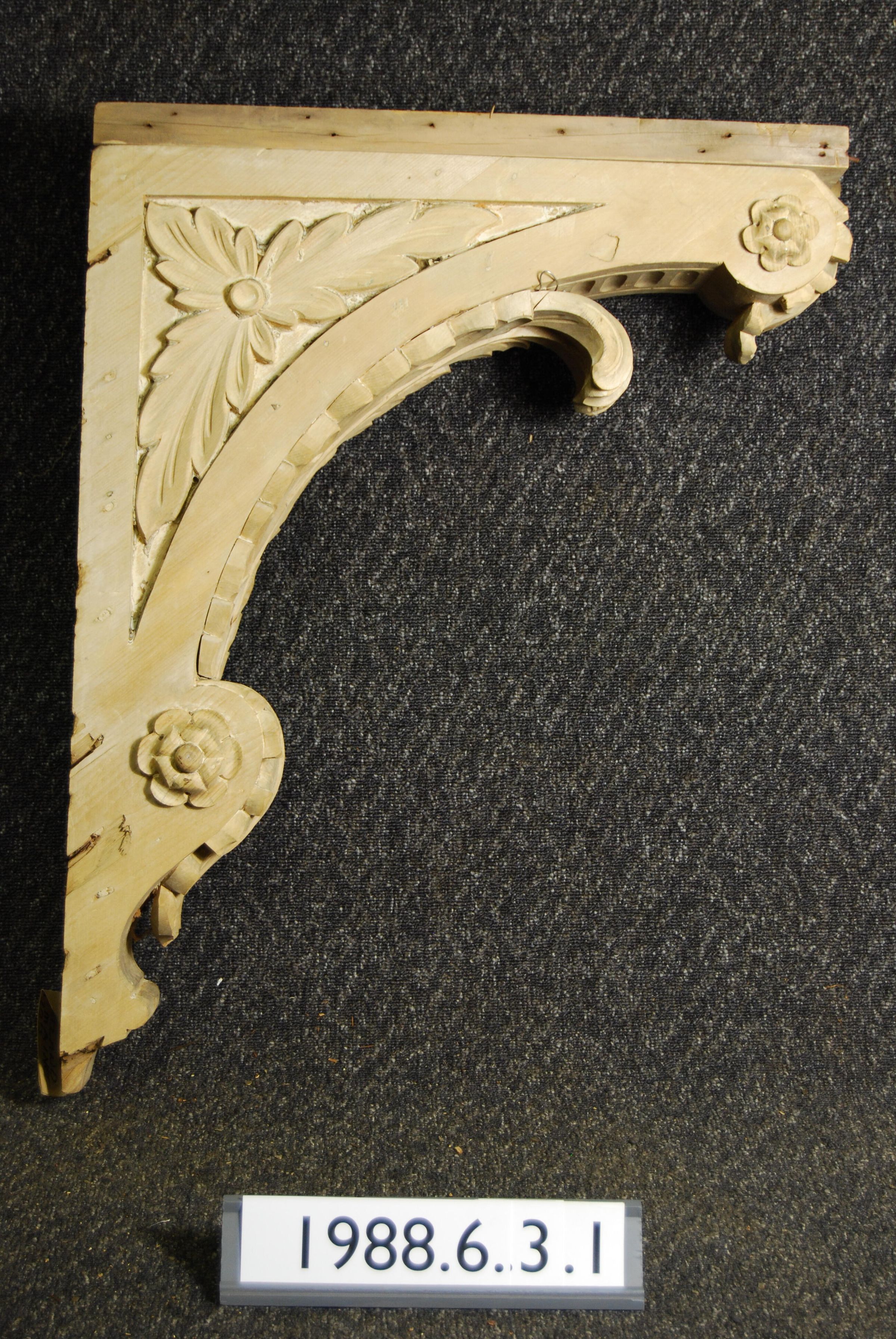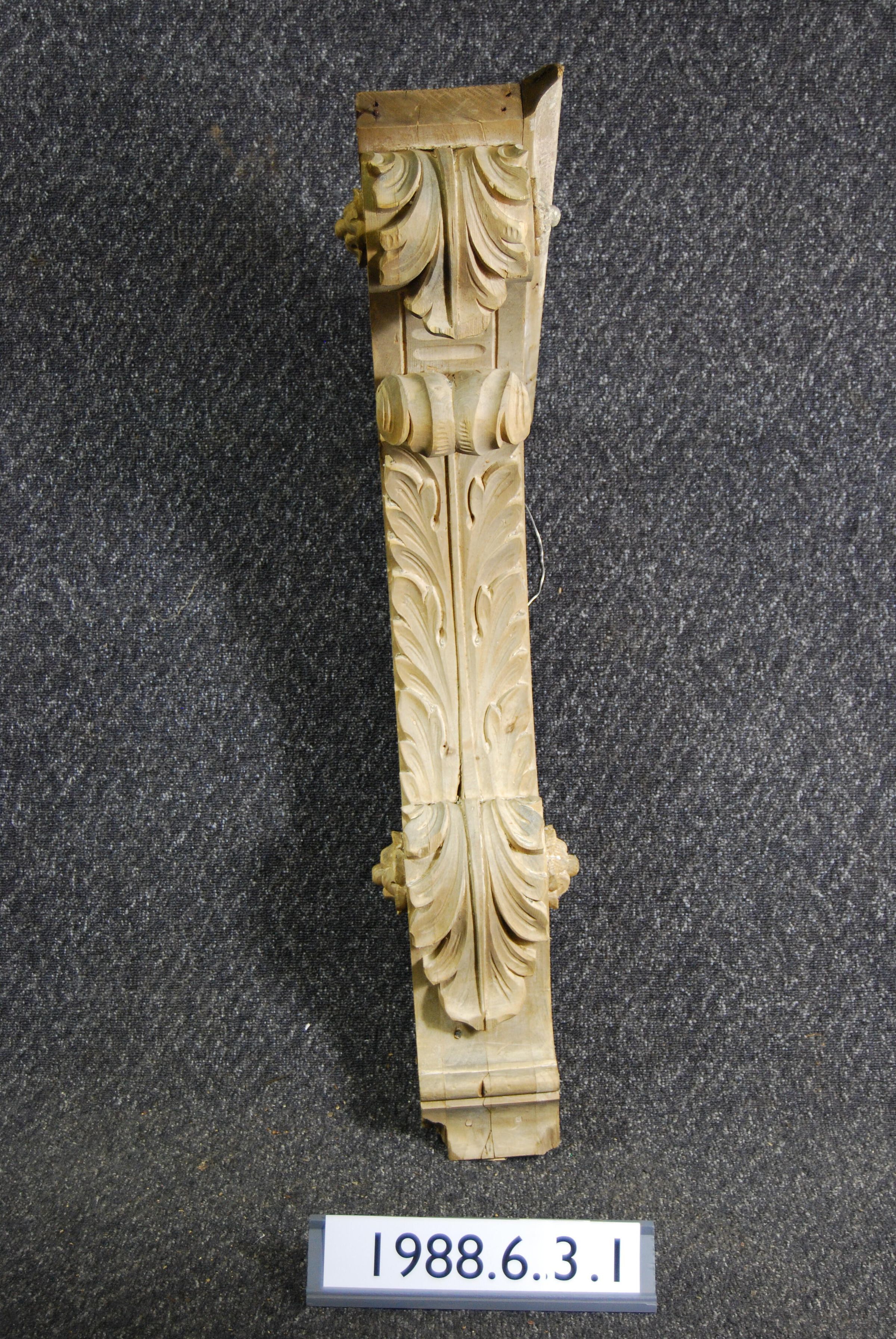 Wood bracket. Each respective side has two rosettes and one recessed panel with carved botanical motif . Front has carved acanthus / botanical motif. Top has molding. Front and left molding missing.