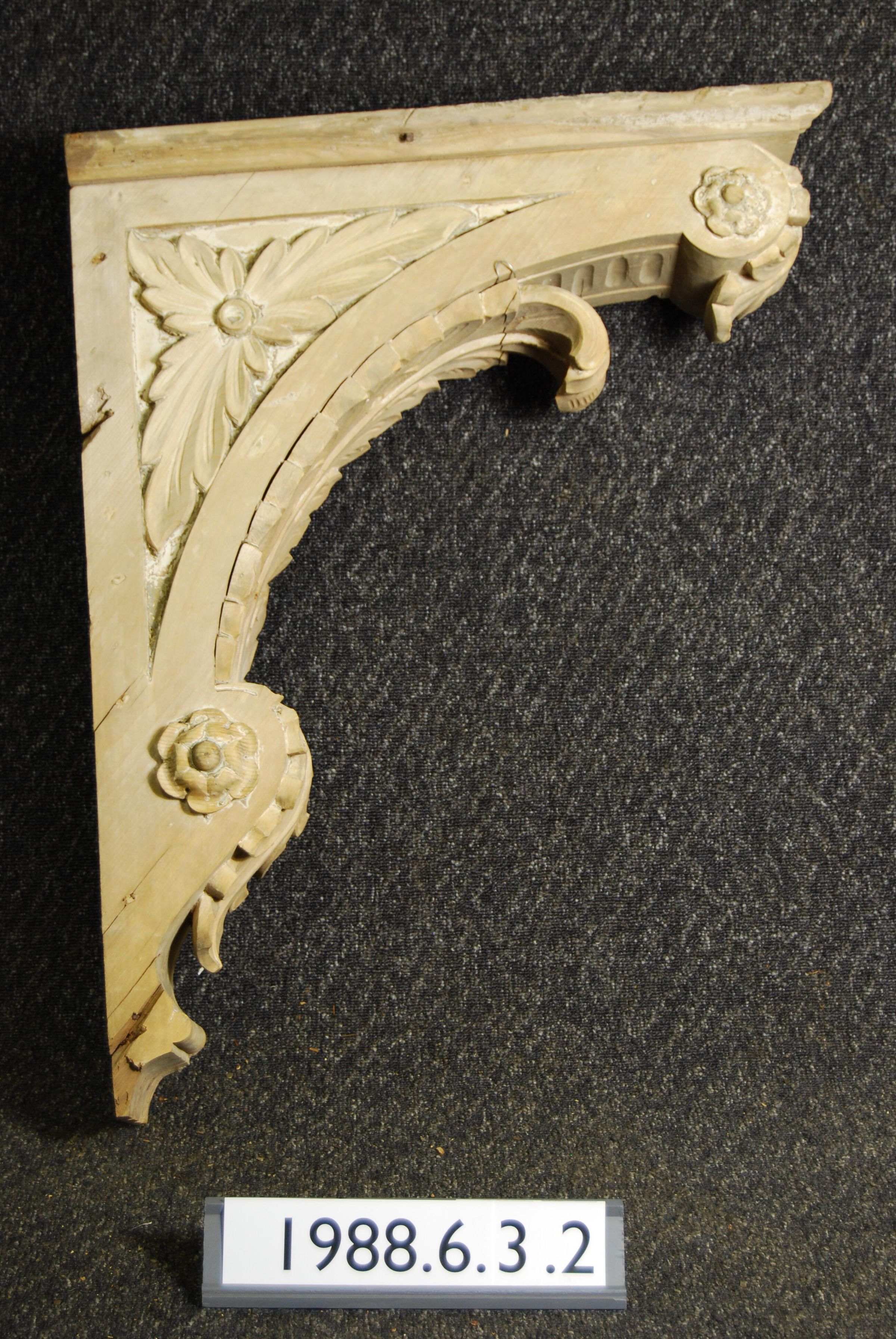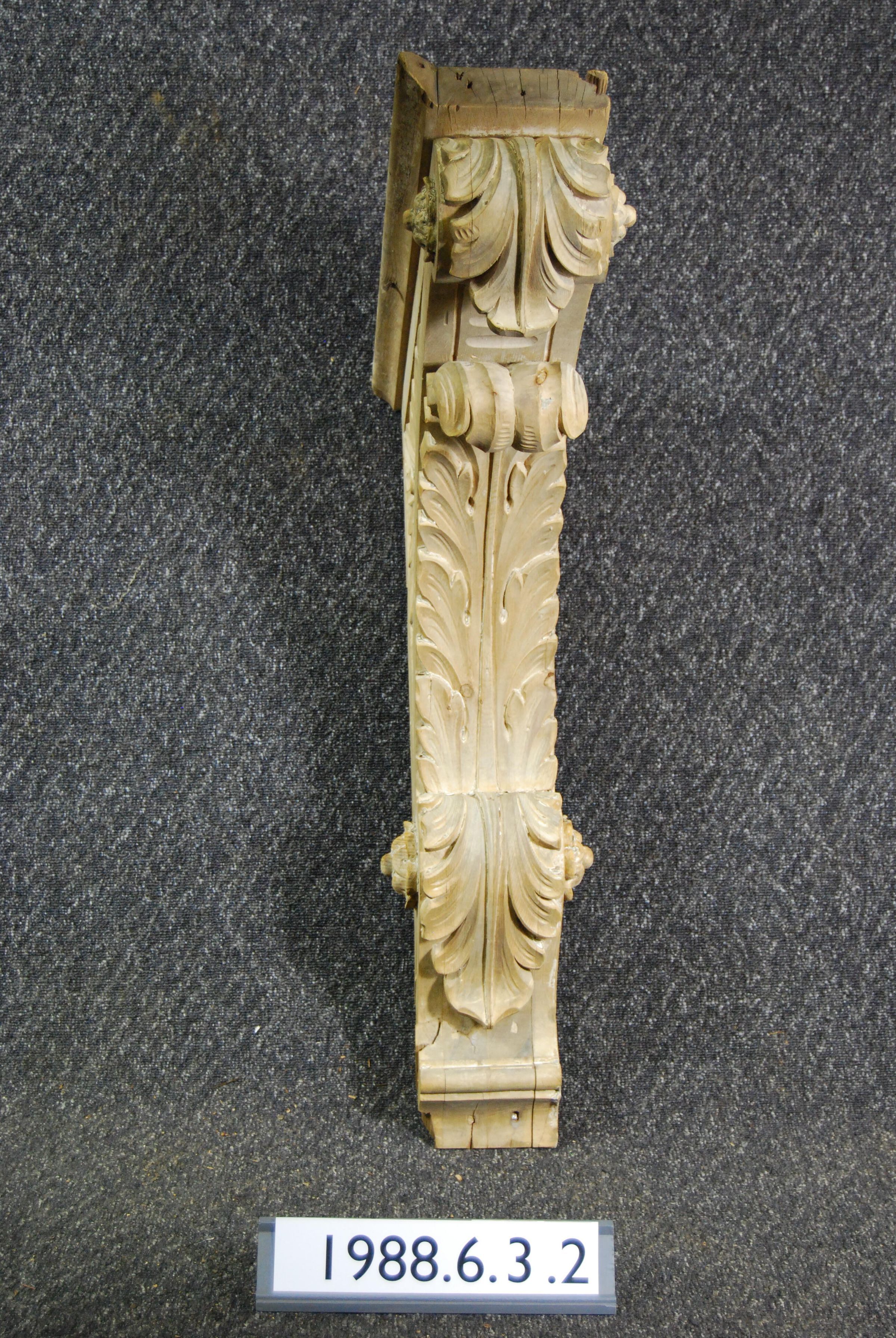Wood bracket. Each respective side has two rosettes and one recessed panel with carved botanical motif . Front has carved acanthus / botanical motif.