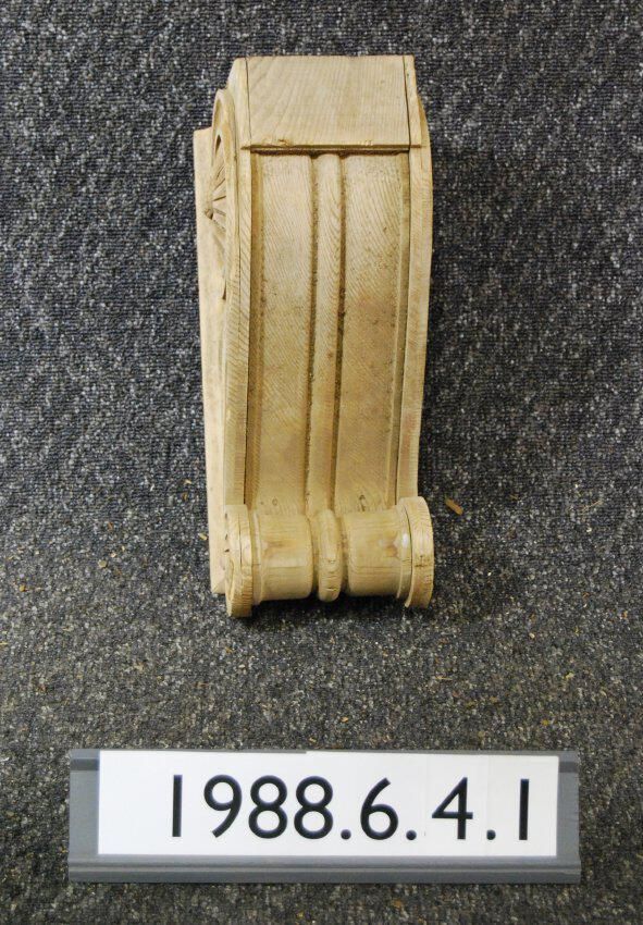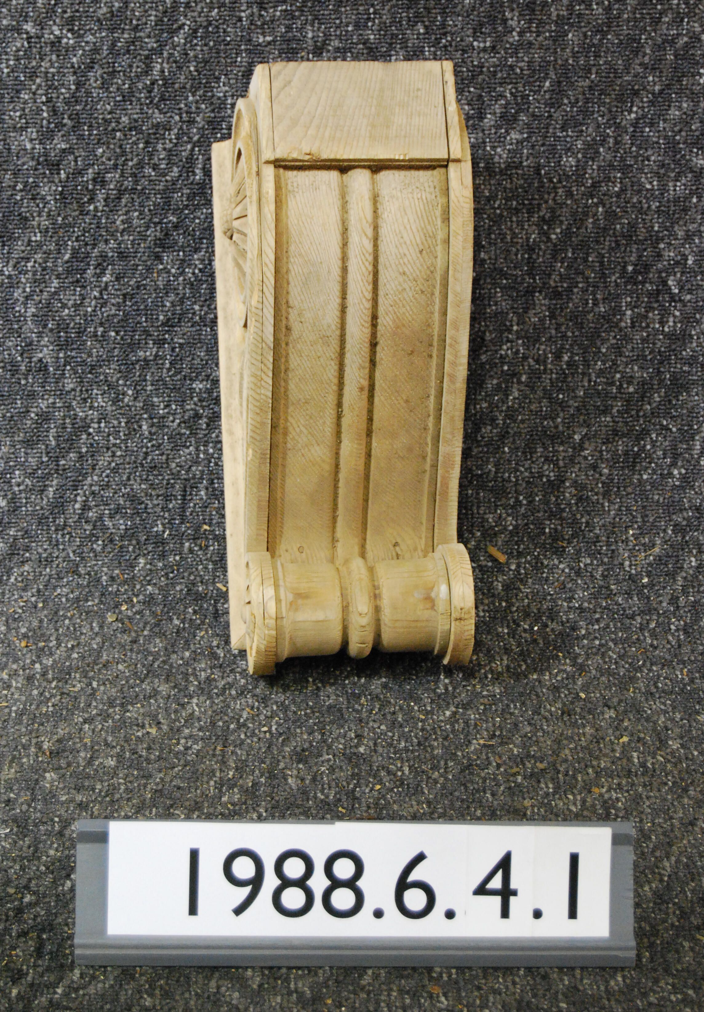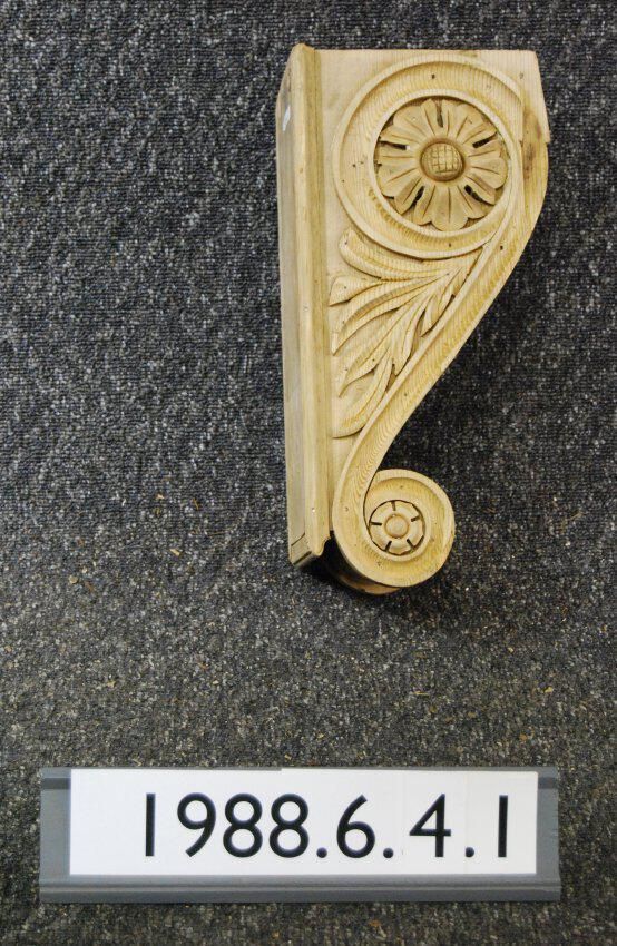 Wood bracket. Each respective side has carved rosettes and botanical motif ornament. Front is molded / fluted. Has reel at one end. Moldings at top edge.