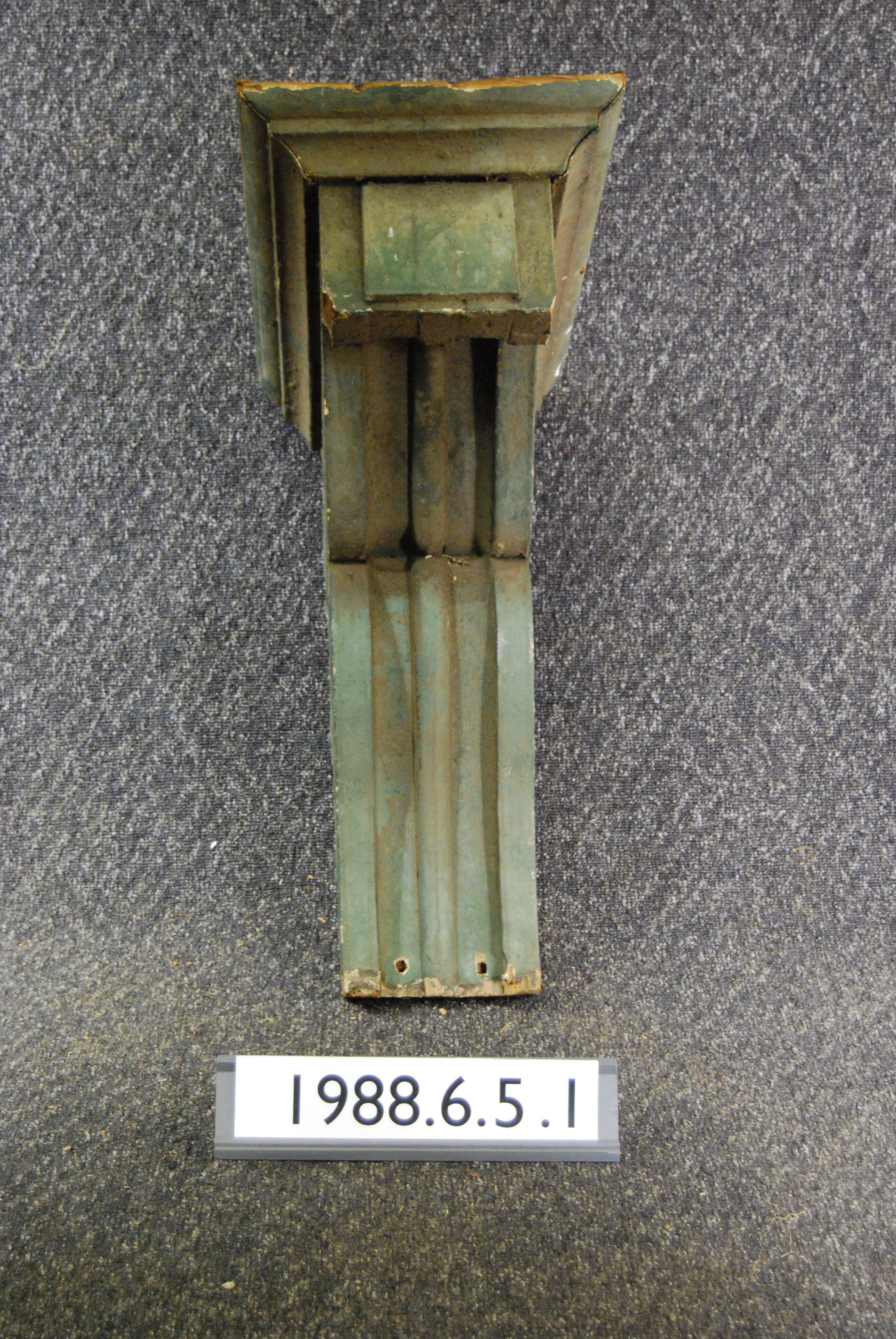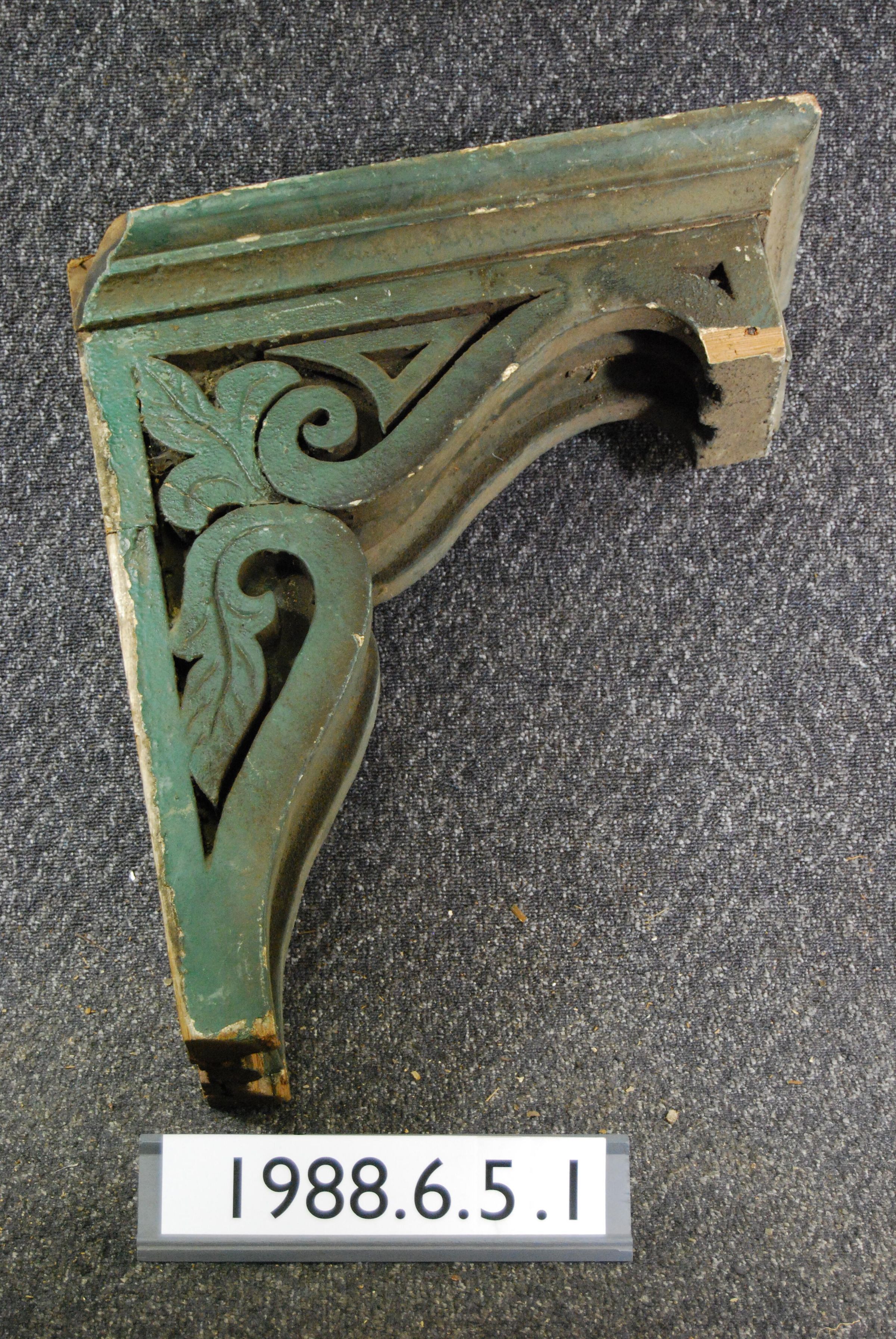 Wood bracket. Scrolled / carved sides with botanical motif. Front is fluted. Top has pyramidal block at front. Moldings at top.
