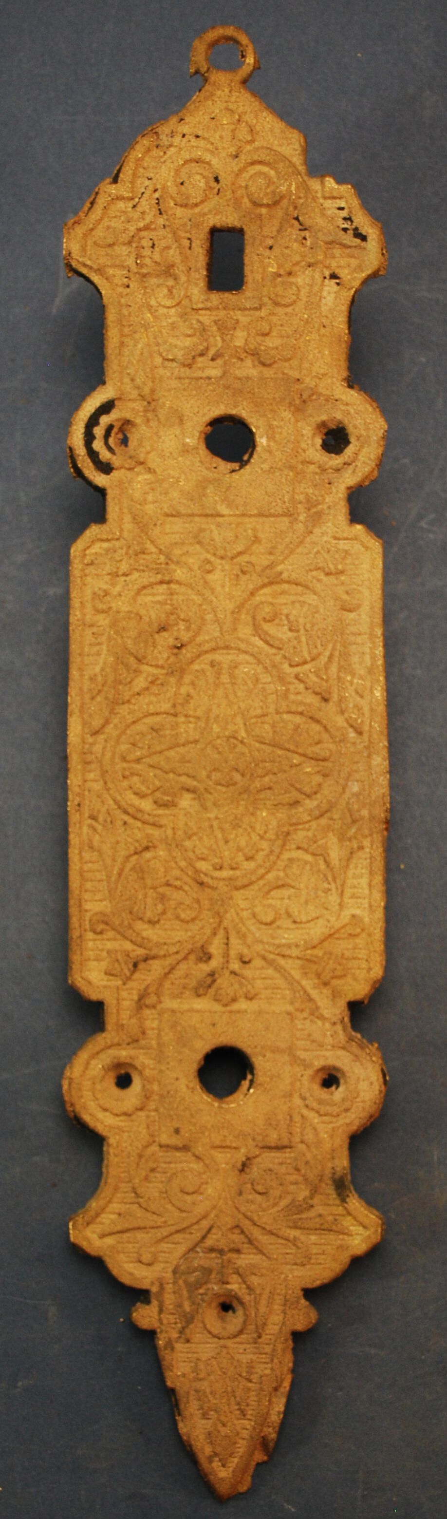 Comments: Reproduction cast in sand, plate casting has not been cleaned up from casting. There is not thumb press. Note: "Shrink" in plate casting. See 1988.3.1404, original handle, matching pattern.Lexicon