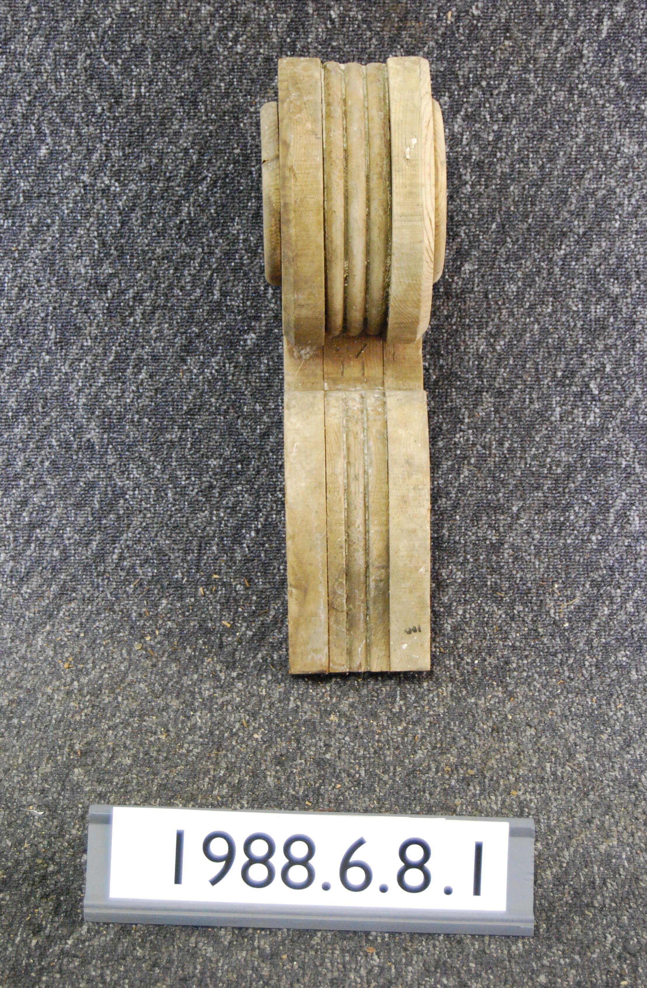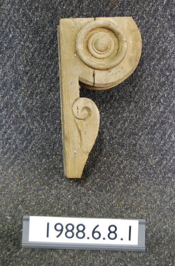 Wood bracket. Scrolled sides. Upper portion has bull'seye at each respective side. Left bullseye is broken / incomplete. Front is reeded. Paint stripped.