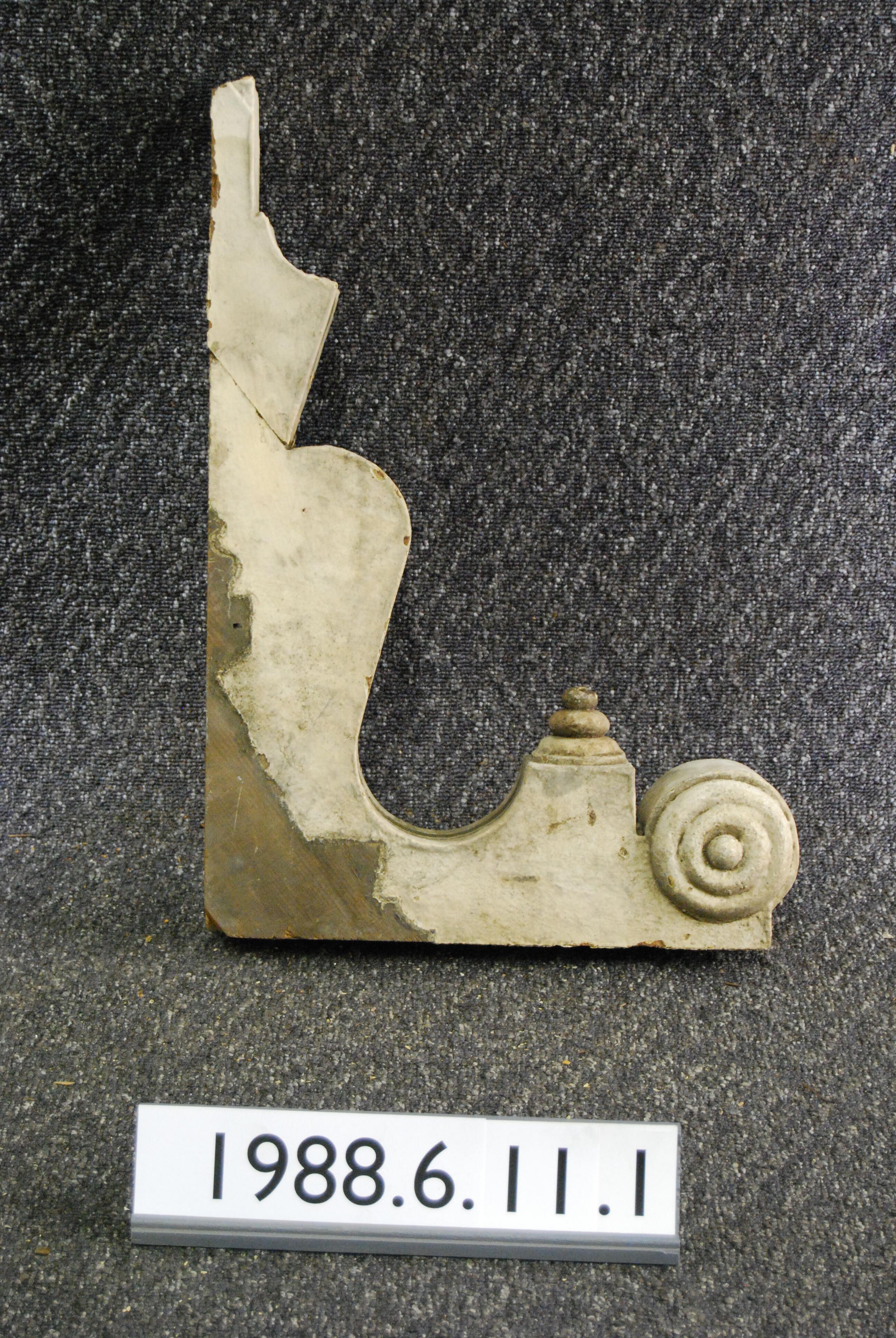 Wood bracket. Each respective side has bullseye ornament. Compound contour. Portion of front is reeded. Has turned drop. Repaired break. Painted beige.