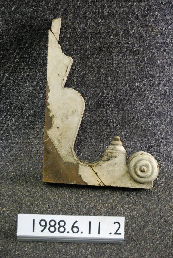 Wood bracket. Each respective side has bullseye ornament. Compound contour. Portion of front is reeded. Has turned drop. Repaired break. Painted beige.