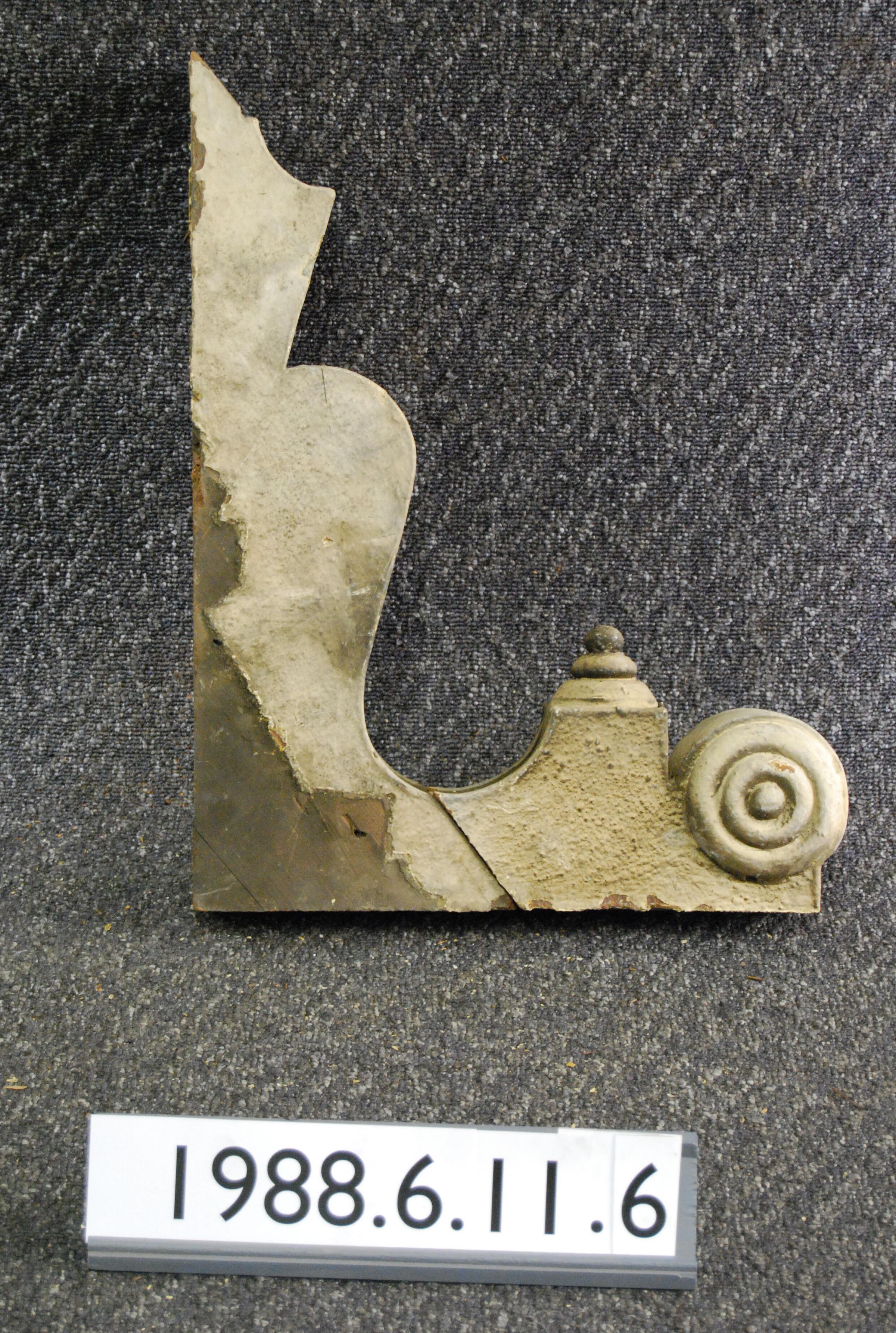 Wood bracket. Each respective side has bullseye ornament. Compound contour. Portion of front is reeded. Has turned drop. Lower corner is missing. Broken into two pieces. Painted beige.
