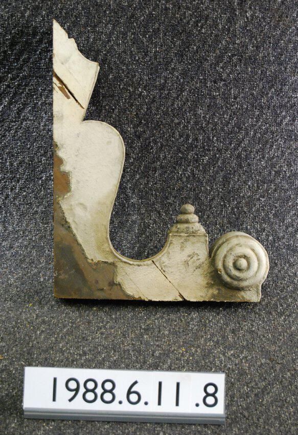 Wood bracket. Each respective side has bullseye ornament. Compound contour. Portion of front is reeded. Has turned drop. Lower end is missing. Repaired breaks.