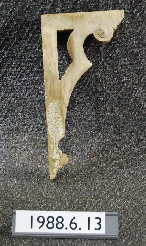 Wood bracket. Each respective side has button ornament. Compound curved contour. Cut out center. Portion of front is reeded, remnants of paint but partially stripped.