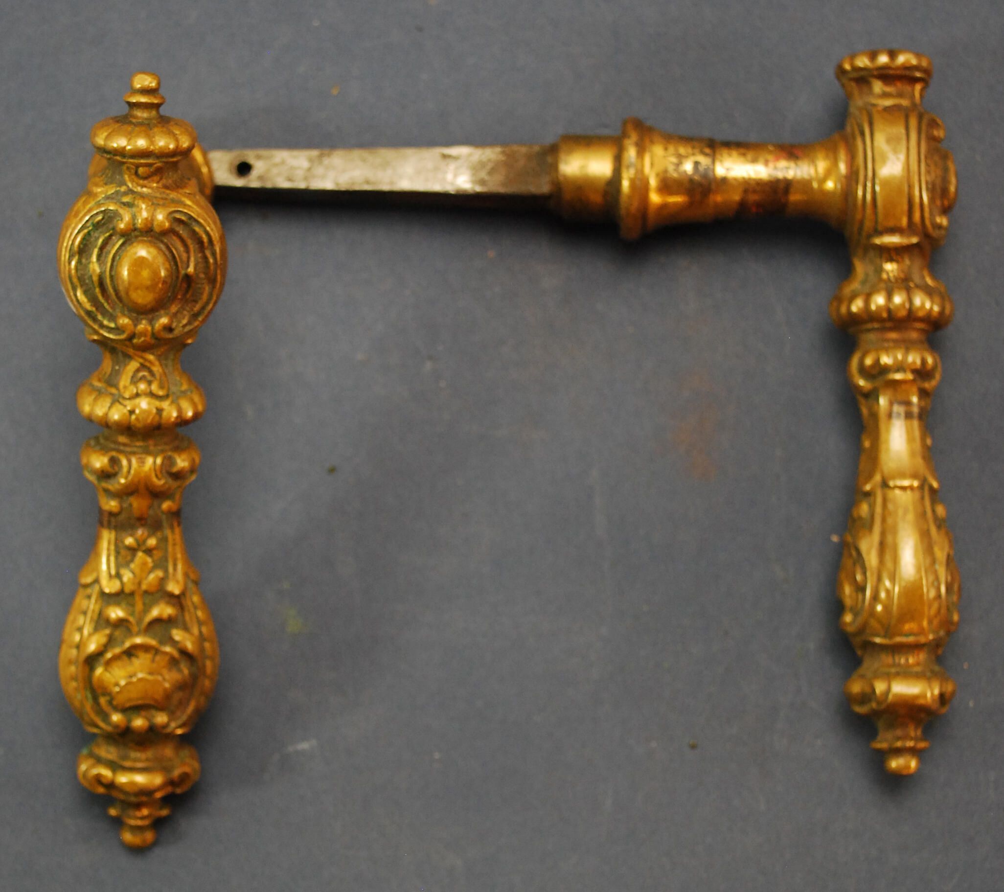 Design Name: Manufacturer: Unknown Style: Material: Bronze / Steel Manufacturing Method: Cast Surface Finish: Aged / Unpolished VDA Classification: VDA Number: Shape: Patent Specifics: Lock Type (If Applicable): Inscription/Makers Mark: Inscription Text: E38 (on old tag) Comments: Pair of "L" shapped handles joined with steel spindle. Remnants of gilting on shank, probably European.