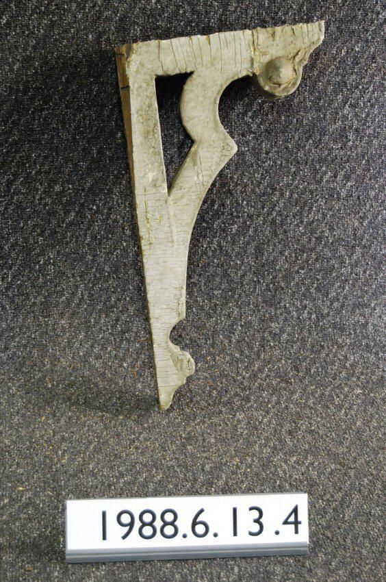 Wood bracket. Each respective side has button ornament. Compound curved contour. Cut out center. Portion of front is reeded. Painted grey. Inscriptions or Markings: Manufacturer: Place of Manufacturer: Design motif: Style: Finish: Painted