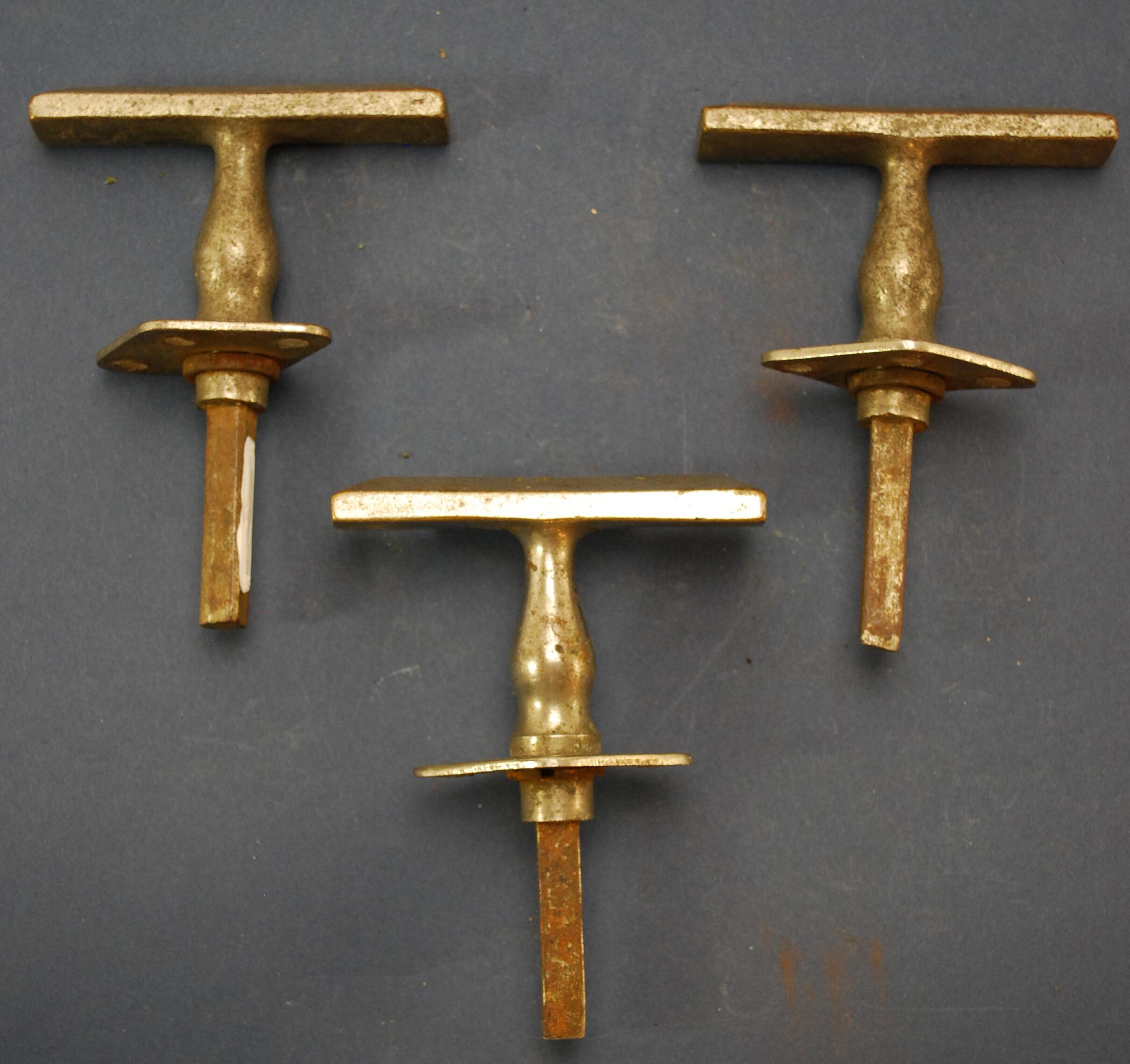 Design Name: Manufacturer: Unknown Style: Material: Brass / Steel Manufacturing Method: Cast Surface Finish: Plated, nickel VDA Classification: VDA Number: Shape: Patent Specifics: Lock Type (If Applicable): Inscription/Makers Mark: Inscription Text: Comments: Set of three "T" handles with flat triangular escutcheon.