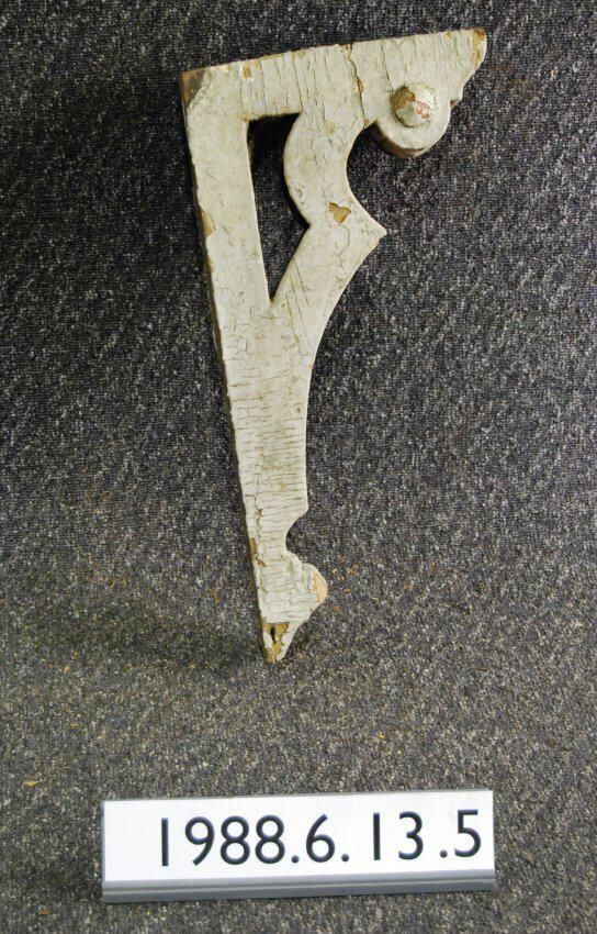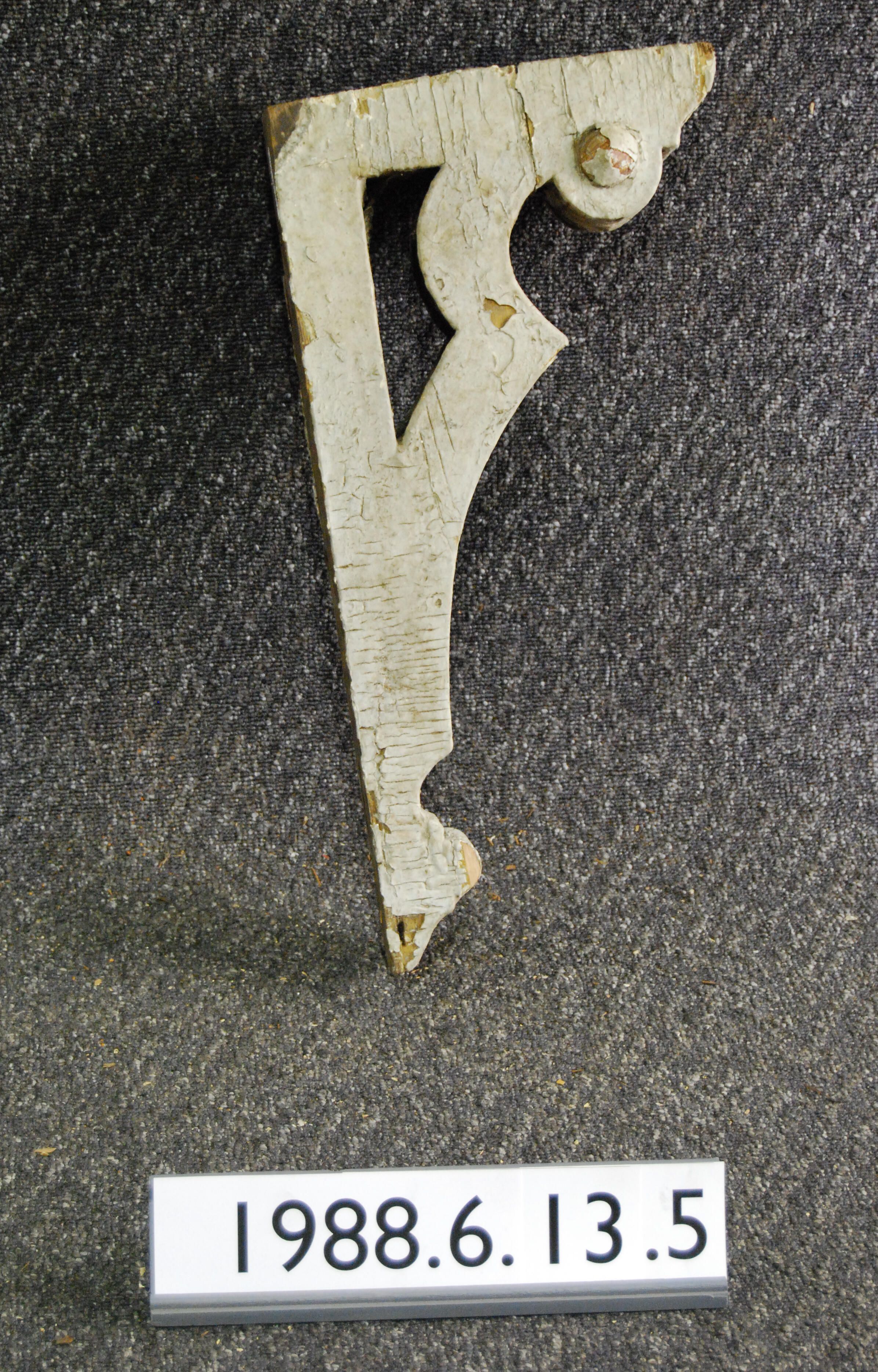 Wood bracket. Each respective side has button ornament. Compound curved contour. Cut out center. Portion of front is reeded .Painted grey. Inscriptions or Markings: Manufacturer: Place of Manufacturer: Design motif: Style: Finish: Painted