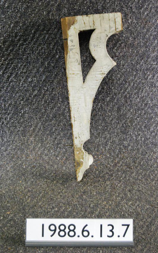 Wood bracket. Upper front end is truncated. Sides have compound curved profile. Cut out center. Portion of front is reeded. Painted grey. Inscriptions or Markings: Manufacturer: Place of Manufacturer: Design motif: Style: Finish: Painted
